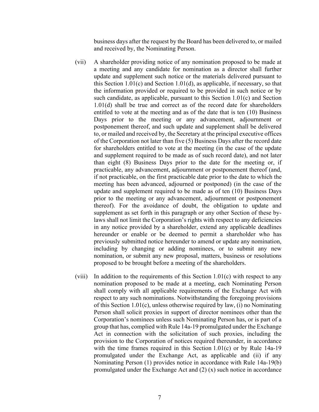 7 business days after the request by the Board has been delivered to, or mailed and received by, the Nominating Person. (vii) A shareholder providing notice of any nomination proposed to be made at a meeting and any candidate for nomination as a director shall further update and supplement such notice or the materials delivered pursuant to this Section 1.01(c) and Section 1.01(d), as applicable, if necessary, so that the information provided or required to be provided in such notice or by such candidate, as applicable, pursuant to this Section 1.01(c) and Section 1.01(d) shall be true and correct as of the record date for shareholders entitled to vote at the meeting and as of the date that is ten (10) Business Days prior to the meeting or any advancement, adjournment or postponement thereof, and such update and supplement shall be delivered to, or mailed and received by, the Secretary at the principal executive offices of the Corporation not later than five (5) Business Days after the record date for shareholders entitled to vote at the meeting (in the case of the update and supplement required to be made as of such record date), and not later than eight (8) Business Days prior to the date for the meeting or, if practicable, any advancement, adjournment or postponement thereof (and, if not practicable, on the first practicable date prior to the date to which the meeting has been advanced, adjourned or postponed) (in the case of the update and supplement required to be made as of ten (10) Business Days prior to the meeting or any advancement, adjournment or postponement thereof). For the avoidance of doubt, the obligation to update and supplement as set forth in this paragraph or any other Section of these by- laws shall not limit the Corporation’s rights with respect to any deficiencies in any notice provided by a shareholder, extend any applicable deadlines hereunder or enable or be deemed to permit a shareholder who has previously submitted notice hereunder to amend or update any nomination, including by changing or adding nominees, or to submit any new nomination, or submit any new proposal, matters, business or resolutions proposed to be brought before a meeting of the shareholders. (viii) In addition to the requirements of this Section 1.01(c) with respect to any nomination proposed to be made at a meeting, each Nominating Person shall comply with all applicable requirements of the Exchange Act with respect to any such nominations. Notwithstanding the foregoing provisions of this Section 1.01(c), unless otherwise required by law, (i) no Nominating Person shall solicit proxies in support of director nominees other than the Corporation’s nominees unless such Nominating Person has, or is part of a group that has, complied with Rule 14a-19 promulgated under the Exchange Act in connection with the solicitation of such proxies, including the provision to the Corporation of notices required thereunder, in accordance with the time frames required in this Section 1.01(c) or by Rule 14a-19 promulgated under the Exchange Act, as applicable and (ii) if any Nominating Person (1) provides notice in accordance with Rule 14a-19(b) promulgated under the Exchange Act and (2) (x) such notice in accordance