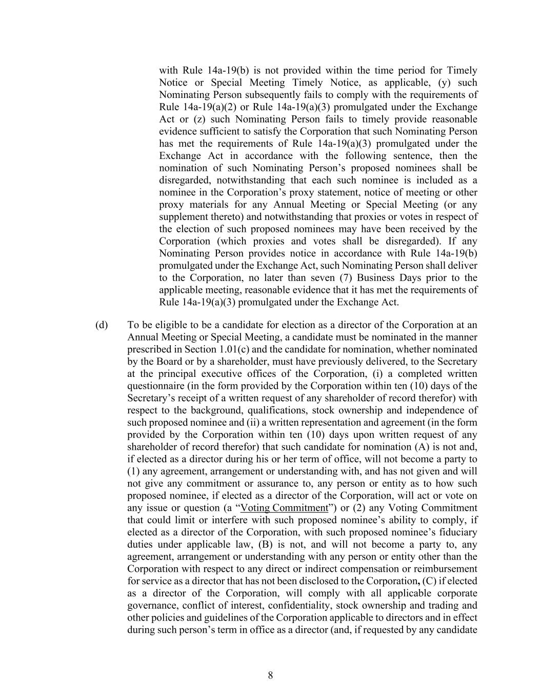 8 with Rule 14a-19(b) is not provided within the time period for Timely Notice or Special Meeting Timely Notice, as applicable, (y) such Nominating Person subsequently fails to comply with the requirements of Rule 14a-19(a)(2) or Rule 14a-19(a)(3) promulgated under the Exchange Act or (z) such Nominating Person fails to timely provide reasonable evidence sufficient to satisfy the Corporation that such Nominating Person has met the requirements of Rule 14a-19(a)(3) promulgated under the Exchange Act in accordance with the following sentence, then the nomination of such Nominating Person’s proposed nominees shall be disregarded, notwithstanding that each such nominee is included as a nominee in the Corporation’s proxy statement, notice of meeting or other proxy materials for any Annual Meeting or Special Meeting (or any supplement thereto) and notwithstanding that proxies or votes in respect of the election of such proposed nominees may have been received by the Corporation (which proxies and votes shall be disregarded). If any Nominating Person provides notice in accordance with Rule 14a-19(b) promulgated under the Exchange Act, such Nominating Person shall deliver to the Corporation, no later than seven (7) Business Days prior to the applicable meeting, reasonable evidence that it has met the requirements of Rule 14a-19(a)(3) promulgated under the Exchange Act. (d) To be eligible to be a candidate for election as a director of the Corporation at an Annual Meeting or Special Meeting, a candidate must be nominated in the manner prescribed in Section 1.01(c) and the candidate for nomination, whether nominated by the Board or by a shareholder, must have previously delivered, to the Secretary at the principal executive offices of the Corporation, (i) a completed written questionnaire (in the form provided by the Corporation within ten (10) days of the Secretary’s receipt of a written request of any shareholder of record therefor) with respect to the background, qualifications, stock ownership and independence of such proposed nominee and (ii) a written representation and agreement (in the form provided by the Corporation within ten (10) days upon written request of any shareholder of record therefor) that such candidate for nomination (A) is not and, if elected as a director during his or her term of office, will not become a party to (1) any agreement, arrangement or understanding with, and has not given and will not give any commitment or assurance to, any person or entity as to how such proposed nominee, if elected as a director of the Corporation, will act or vote on any issue or question (a “Voting Commitment”) or (2) any Voting Commitment that could limit or interfere with such proposed nominee’s ability to comply, if elected as a director of the Corporation, with such proposed nominee’s fiduciary duties under applicable law, (B) is not, and will not become a party to, any agreement, arrangement or understanding with any person or entity other than the Corporation with respect to any direct or indirect compensation or reimbursement for service as a director that has not been disclosed to the Corporation, (C) if elected as a director of the Corporation, will comply with all applicable corporate governance, conflict of interest, confidentiality, stock ownership and trading and other policies and guidelines of the Corporation applicable to directors and in effect during such person’s term in office as a director (and, if requested by any candidate