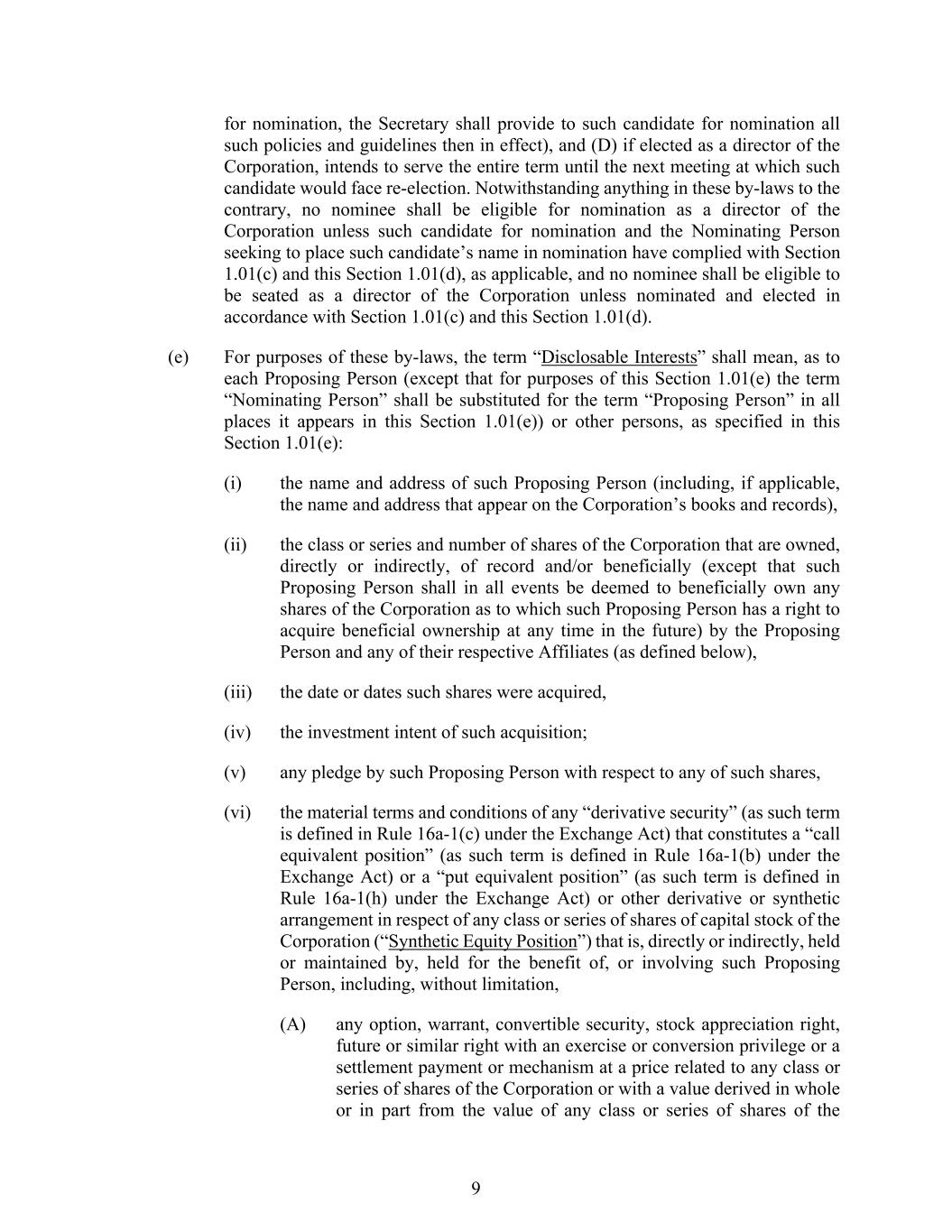 9 for nomination, the Secretary shall provide to such candidate for nomination all such policies and guidelines then in effect), and (D) if elected as a director of the Corporation, intends to serve the entire term until the next meeting at which such candidate would face re-election. Notwithstanding anything in these by-laws to the contrary, no nominee shall be eligible for nomination as a director of the Corporation unless such candidate for nomination and the Nominating Person seeking to place such candidate’s name in nomination have complied with Section 1.01(c) and this Section 1.01(d), as applicable, and no nominee shall be eligible to be seated as a director of the Corporation unless nominated and elected in accordance with Section 1.01(c) and this Section 1.01(d). (e) For purposes of these by-laws, the term “Disclosable Interests” shall mean, as to each Proposing Person (except that for purposes of this Section 1.01(e) the term “Nominating Person” shall be substituted for the term “Proposing Person” in all places it appears in this Section 1.01(e)) or other persons, as specified in this Section 1.01(e): (i) the name and address of such Proposing Person (including, if applicable, the name and address that appear on the Corporation’s books and records), (ii) the class or series and number of shares of the Corporation that are owned, directly or indirectly, of record and/or beneficially (except that such Proposing Person shall in all events be deemed to beneficially own any shares of the Corporation as to which such Proposing Person has a right to acquire beneficial ownership at any time in the future) by the Proposing Person and any of their respective Affiliates (as defined below), (iii) the date or dates such shares were acquired, (iv) the investment intent of such acquisition; (v) any pledge by such Proposing Person with respect to any of such shares, (vi) the material terms and conditions of any “derivative security” (as such term is defined in Rule 16a-1(c) under the Exchange Act) that constitutes a “call equivalent position” (as such term is defined in Rule 16a-1(b) under the Exchange Act) or a “put equivalent position” (as such term is defined in Rule 16a-1(h) under the Exchange Act) or other derivative or synthetic arrangement in respect of any class or series of shares of capital stock of the Corporation (“Synthetic Equity Position”) that is, directly or indirectly, held or maintained by, held for the benefit of, or involving such Proposing Person, including, without limitation, (A) any option, warrant, convertible security, stock appreciation right, future or similar right with an exercise or conversion privilege or a settlement payment or mechanism at a price related to any class or series of shares of the Corporation or with a value derived in whole or in part from the value of any class or series of shares of the