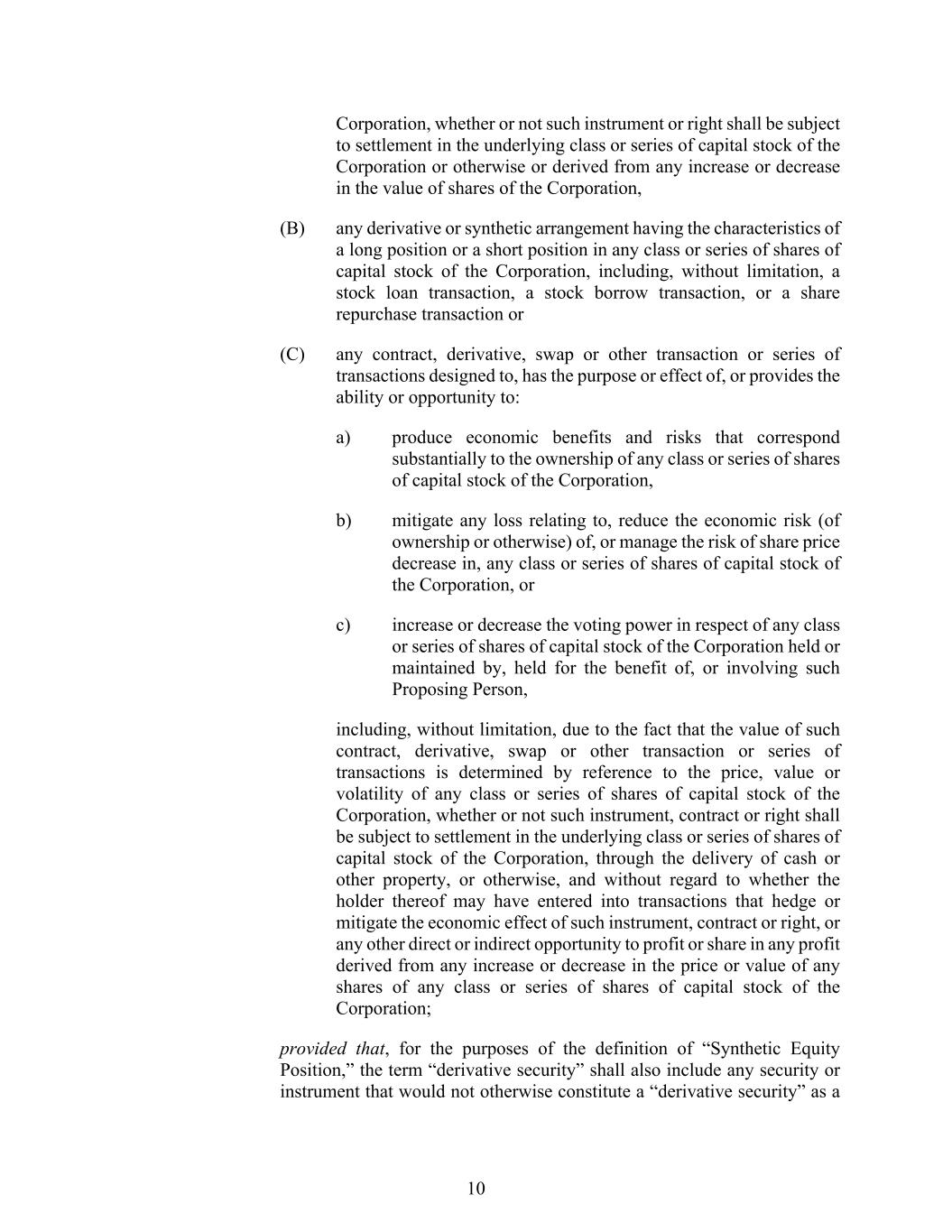 10 Corporation, whether or not such instrument or right shall be subject to settlement in the underlying class or series of capital stock of the Corporation or otherwise or derived from any increase or decrease in the value of shares of the Corporation, (B) any derivative or synthetic arrangement having the characteristics of a long position or a short position in any class or series of shares of capital stock of the Corporation, including, without limitation, a stock loan transaction, a stock borrow transaction, or a share repurchase transaction or (C) any contract, derivative, swap or other transaction or series of transactions designed to, has the purpose or effect of, or provides the ability or opportunity to: a) produce economic benefits and risks that correspond substantially to the ownership of any class or series of shares of capital stock of the Corporation, b) mitigate any loss relating to, reduce the economic risk (of ownership or otherwise) of, or manage the risk of share price decrease in, any class or series of shares of capital stock of the Corporation, or c) increase or decrease the voting power in respect of any class or series of shares of capital stock of the Corporation held or maintained by, held for the benefit of, or involving such Proposing Person, including, without limitation, due to the fact that the value of such contract, derivative, swap or other transaction or series of transactions is determined by reference to the price, value or volatility of any class or series of shares of capital stock of the Corporation, whether or not such instrument, contract or right shall be subject to settlement in the underlying class or series of shares of capital stock of the Corporation, through the delivery of cash or other property, or otherwise, and without regard to whether the holder thereof may have entered into transactions that hedge or mitigate the economic effect of such instrument, contract or right, or any other direct or indirect opportunity to profit or share in any profit derived from any increase or decrease in the price or value of any shares of any class or series of shares of capital stock of the Corporation; provided that, for the purposes of the definition of “Synthetic Equity Position,” the term “derivative security” shall also include any security or instrument that would not otherwise constitute a “derivative security” as a