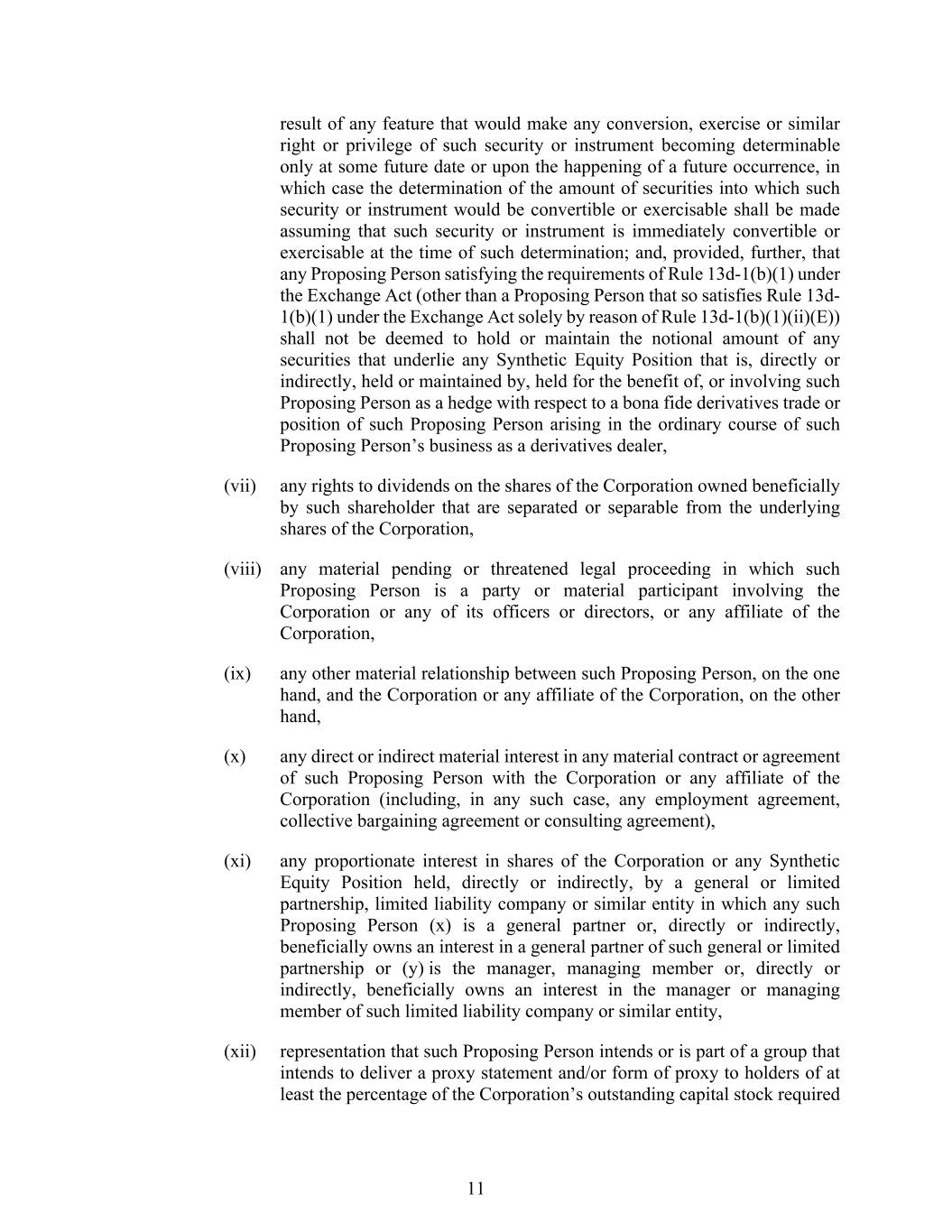 11 result of any feature that would make any conversion, exercise or similar right or privilege of such security or instrument becoming determinable only at some future date or upon the happening of a future occurrence, in which case the determination of the amount of securities into which such security or instrument would be convertible or exercisable shall be made assuming that such security or instrument is immediately convertible or exercisable at the time of such determination; and, provided, further, that any Proposing Person satisfying the requirements of Rule 13d-1(b)(1) under the Exchange Act (other than a Proposing Person that so satisfies Rule 13d- 1(b)(1) under the Exchange Act solely by reason of Rule 13d-1(b)(1)(ii)(E)) shall not be deemed to hold or maintain the notional amount of any securities that underlie any Synthetic Equity Position that is, directly or indirectly, held or maintained by, held for the benefit of, or involving such Proposing Person as a hedge with respect to a bona fide derivatives trade or position of such Proposing Person arising in the ordinary course of such Proposing Person’s business as a derivatives dealer, (vii) any rights to dividends on the shares of the Corporation owned beneficially by such shareholder that are separated or separable from the underlying shares of the Corporation, (viii) any material pending or threatened legal proceeding in which such Proposing Person is a party or material participant involving the Corporation or any of its officers or directors, or any affiliate of the Corporation, (ix) any other material relationship between such Proposing Person, on the one hand, and the Corporation or any affiliate of the Corporation, on the other hand, (x) any direct or indirect material interest in any material contract or agreement of such Proposing Person with the Corporation or any affiliate of the Corporation (including, in any such case, any employment agreement, collective bargaining agreement or consulting agreement), (xi) any proportionate interest in shares of the Corporation or any Synthetic Equity Position held, directly or indirectly, by a general or limited partnership, limited liability company or similar entity in which any such Proposing Person (x) is a general partner or, directly or indirectly, beneficially owns an interest in a general partner of such general or limited partnership or (y) is the manager, managing member or, directly or indirectly, beneficially owns an interest in the manager or managing member of such limited liability company or similar entity, (xii) representation that such Proposing Person intends or is part of a group that intends to deliver a proxy statement and/or form of proxy to holders of at least the percentage of the Corporation’s outstanding capital stock required