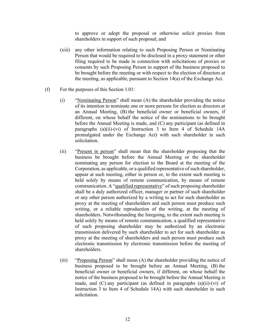 12 to approve or adopt the proposal or otherwise solicit proxies from shareholders in support of such proposal; and (xiii) any other information relating to such Proposing Person or Nominating Person that would be required to be disclosed in a proxy statement or other filing required to be made in connection with solicitations of proxies or consents by such Proposing Person in support of the business proposed to be brought before the meeting or with respect to the election of directors at the meeting, as applicable, pursuant to Section 14(a) of the Exchange Act. (f) For the purposes of this Section 1.01: (i) “Nominating Person” shall mean (A) the shareholder providing the notice of its intention to nominate one or more persons for election as directors at an Annual Meeting, (B) the beneficial owner or beneficial owners, if different, on whose behalf the notice of the nominations to be brought before the Annual Meeting is made, and (C) any participant (as defined in paragraphs (a)(ii)-(vi) of Instruction 3 to Item 4 of Schedule 14A promulgated under the Exchange Act) with such shareholder in such solicitation. (ii) “Present in person” shall mean that the shareholder proposing that the business be brought before the Annual Meeting or the shareholder nominating any person for election to the Board at the meeting of the Corporation, as applicable, or a qualified representative of such shareholder, appear at such meeting, either in person or, to the extent such meeting is held solely by means of remote communication, by means of remote communication. A “qualified representative” of such proposing shareholder shall be a duly authorized officer, manager or partner of such shareholder or any other person authorized by a writing to act for such shareholder as proxy at the meeting of shareholders and such person must produce such writing, or a reliable reproduction of the writing, at the meeting of shareholders. Notwithstanding the foregoing, to the extent such meeting is held solely by means of remote communication, a qualified representative of such proposing shareholder may be authorized by an electronic transmission delivered by such shareholder to act for such shareholder as proxy at the meeting of shareholders and such person must produce such electronic transmission by electronic transmission before the meeting of shareholders. (iii) “Proposing Person” shall mean (A) the shareholder providing the notice of business proposed to be brought before an Annual Meeting, (B) the beneficial owner or beneficial owners, if different, on whose behalf the notice of the business proposed to be brought before the Annual Meeting is made, and (C) any participant (as defined in paragraphs (a)(ii)-(vi) of Instruction 3 to Item 4 of Schedule 14A) with such shareholder in such solicitation.