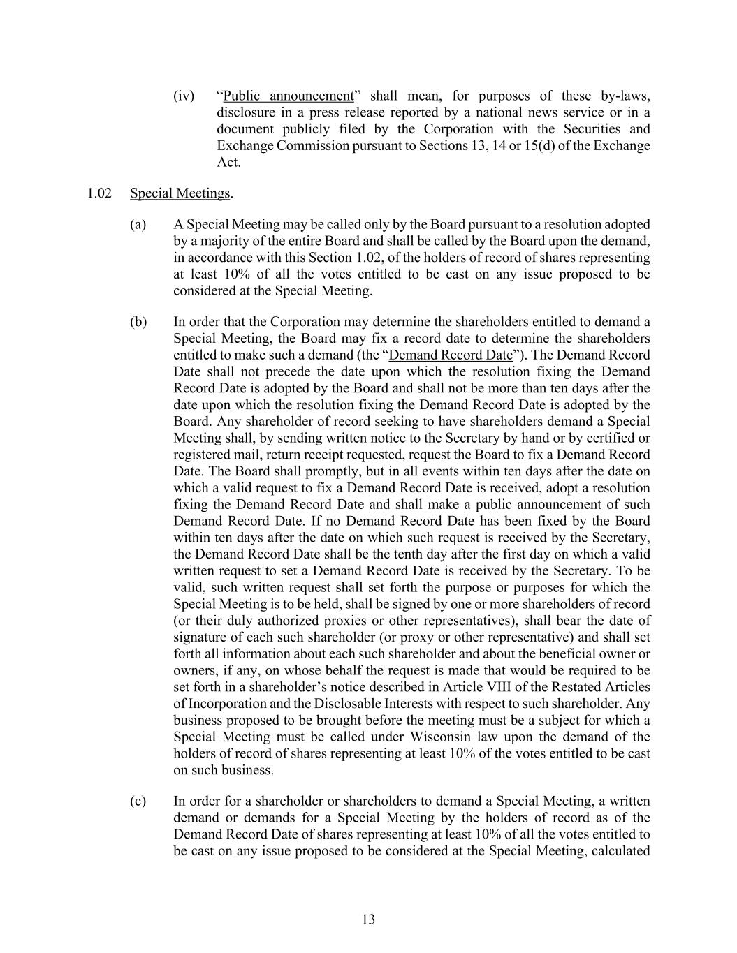 13 (iv) “Public announcement” shall mean, for purposes of these by-laws, disclosure in a press release reported by a national news service or in a document publicly filed by the Corporation with the Securities and Exchange Commission pursuant to Sections 13, 14 or 15(d) of the Exchange Act. 1.02 Special Meetings. (a) A Special Meeting may be called only by the Board pursuant to a resolution adopted by a majority of the entire Board and shall be called by the Board upon the demand, in accordance with this Section 1.02, of the holders of record of shares representing at least 10% of all the votes entitled to be cast on any issue proposed to be considered at the Special Meeting. (b) In order that the Corporation may determine the shareholders entitled to demand a Special Meeting, the Board may fix a record date to determine the shareholders entitled to make such a demand (the “Demand Record Date”). The Demand Record Date shall not precede the date upon which the resolution fixing the Demand Record Date is adopted by the Board and shall not be more than ten days after the date upon which the resolution fixing the Demand Record Date is adopted by the Board. Any shareholder of record seeking to have shareholders demand a Special Meeting shall, by sending written notice to the Secretary by hand or by certified or registered mail, return receipt requested, request the Board to fix a Demand Record Date. The Board shall promptly, but in all events within ten days after the date on which a valid request to fix a Demand Record Date is received, adopt a resolution fixing the Demand Record Date and shall make a public announcement of such Demand Record Date. If no Demand Record Date has been fixed by the Board within ten days after the date on which such request is received by the Secretary, the Demand Record Date shall be the tenth day after the first day on which a valid written request to set a Demand Record Date is received by the Secretary. To be valid, such written request shall set forth the purpose or purposes for which the Special Meeting is to be held, shall be signed by one or more shareholders of record (or their duly authorized proxies or other representatives), shall bear the date of signature of each such shareholder (or proxy or other representative) and shall set forth all information about each such shareholder and about the beneficial owner or owners, if any, on whose behalf the request is made that would be required to be set forth in a shareholder’s notice described in Article VIII of the Restated Articles of Incorporation and the Disclosable Interests with respect to such shareholder. Any business proposed to be brought before the meeting must be a subject for which a Special Meeting must be called under Wisconsin law upon the demand of the holders of record of shares representing at least 10% of the votes entitled to be cast on such business. (c) In order for a shareholder or shareholders to demand a Special Meeting, a written demand or demands for a Special Meeting by the holders of record as of the Demand Record Date of shares representing at least 10% of all the votes entitled to be cast on any issue proposed to be considered at the Special Meeting, calculated