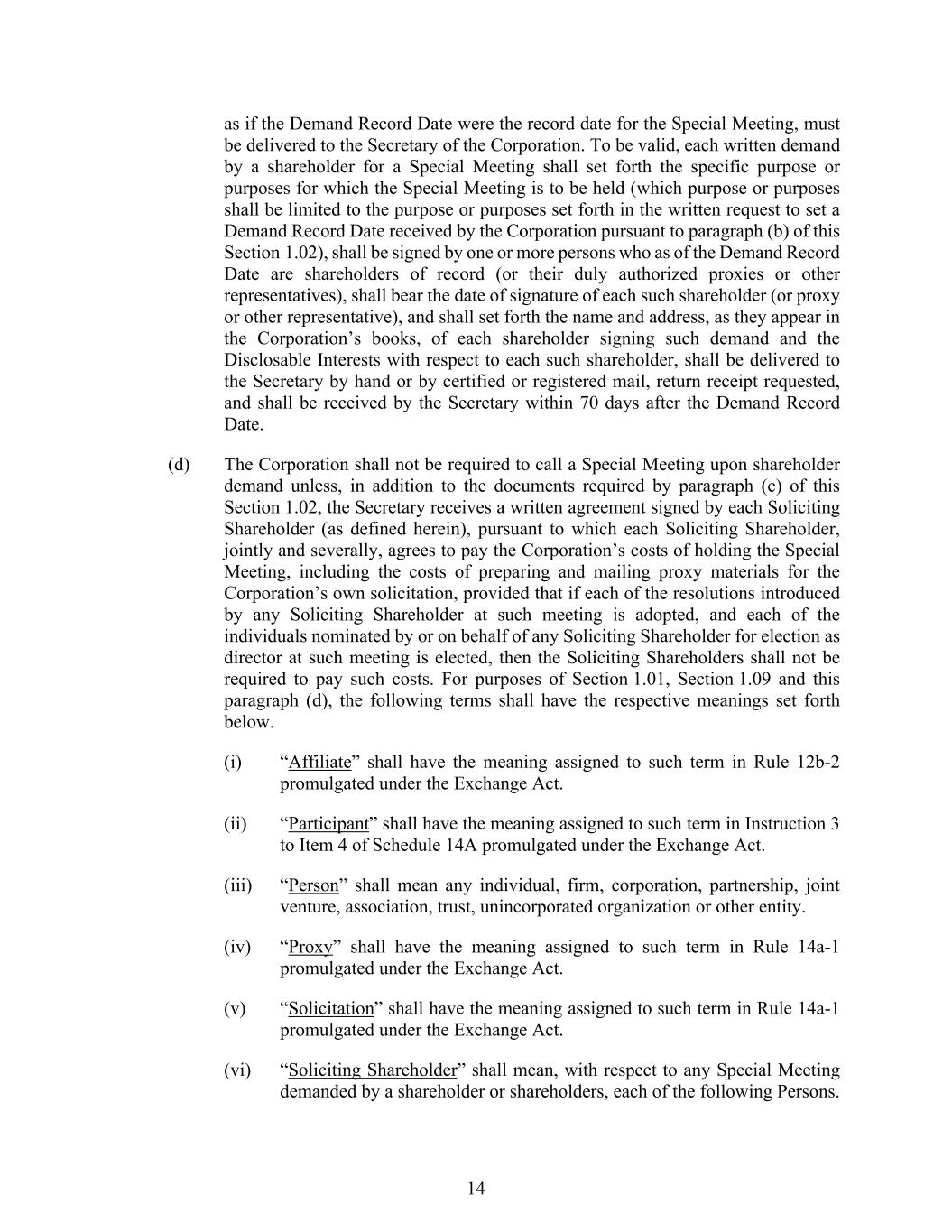 14 as if the Demand Record Date were the record date for the Special Meeting, must be delivered to the Secretary of the Corporation. To be valid, each written demand by a shareholder for a Special Meeting shall set forth the specific purpose or purposes for which the Special Meeting is to be held (which purpose or purposes shall be limited to the purpose or purposes set forth in the written request to set a Demand Record Date received by the Corporation pursuant to paragraph (b) of this Section 1.02), shall be signed by one or more persons who as of the Demand Record Date are shareholders of record (or their duly authorized proxies or other representatives), shall bear the date of signature of each such shareholder (or proxy or other representative), and shall set forth the name and address, as they appear in the Corporation’s books, of each shareholder signing such demand and the Disclosable Interests with respect to each such shareholder, shall be delivered to the Secretary by hand or by certified or registered mail, return receipt requested, and shall be received by the Secretary within 70 days after the Demand Record Date. (d) The Corporation shall not be required to call a Special Meeting upon shareholder demand unless, in addition to the documents required by paragraph (c) of this Section 1.02, the Secretary receives a written agreement signed by each Soliciting Shareholder (as defined herein), pursuant to which each Soliciting Shareholder, jointly and severally, agrees to pay the Corporation’s costs of holding the Special Meeting, including the costs of preparing and mailing proxy materials for the Corporation’s own solicitation, provided that if each of the resolutions introduced by any Soliciting Shareholder at such meeting is adopted, and each of the individuals nominated by or on behalf of any Soliciting Shareholder for election as director at such meeting is elected, then the Soliciting Shareholders shall not be required to pay such costs. For purposes of Section 1.01, Section 1.09 and this paragraph (d), the following terms shall have the respective meanings set forth below. (i) “Affiliate” shall have the meaning assigned to such term in Rule 12b-2 promulgated under the Exchange Act. (ii) “Participant” shall have the meaning assigned to such term in Instruction 3 to Item 4 of Schedule 14A promulgated under the Exchange Act. (iii) “Person” shall mean any individual, firm, corporation, partnership, joint venture, association, trust, unincorporated organization or other entity. (iv) “Proxy” shall have the meaning assigned to such term in Rule 14a-1 promulgated under the Exchange Act. (v) “Solicitation” shall have the meaning assigned to such term in Rule 14a-1 promulgated under the Exchange Act. (vi) “Soliciting Shareholder” shall mean, with respect to any Special Meeting demanded by a shareholder or shareholders, each of the following Persons.