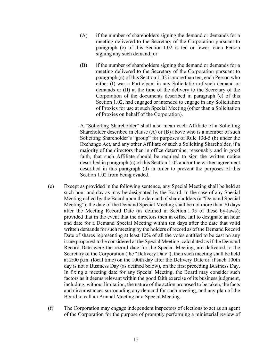 15 (A) if the number of shareholders signing the demand or demands for a meeting delivered to the Secretary of the Corporation pursuant to paragraph (c) of this Section 1.02 is ten or fewer, each Person signing any such demand; or (B) if the number of shareholders signing the demand or demands for a meeting delivered to the Secretary of the Corporation pursuant to paragraph (c) of this Section 1.02 is more than ten, each Person who either (I) was a Participant in any Solicitation of such demand or demands or (II) at the time of the delivery to the Secretary of the Corporation of the documents described in paragraph (c) of this Section 1.02, had engaged or intended to engage in any Solicitation of Proxies for use at such Special Meeting (other than a Solicitation of Proxies on behalf of the Corporation). A “Soliciting Shareholder” shall also mean each Affiliate of a Soliciting Shareholder described in clause (A) or (B) above who is a member of such Soliciting Shareholder’s “group” for purposes of Rule 13d-5 (b) under the Exchange Act, and any other Affiliate of such a Soliciting Shareholder, if a majority of the directors then in office determine, reasonably and in good faith, that such Affiliate should be required to sign the written notice described in paragraph (c) of this Section 1.02 and/or the written agreement described in this paragraph (d) in order to prevent the purposes of this Section 1.02 from being evaded. (e) Except as provided in the following sentence, any Special Meeting shall be held at such hour and day as may be designated by the Board. In the case of any Special Meeting called by the Board upon the demand of shareholders (a “Demand Special Meeting”), the date of the Demand Special Meeting shall be not more than 70 days after the Meeting Record Date (as defined in Section 1.05 of these by-laws); provided that in the event that the directors then in office fail to designate an hour and date for a Demand Special Meeting within ten days after the date that valid written demands for such meeting by the holders of record as of the Demand Record Date of shares representing at least 10% of all the votes entitled to be cast on any issue proposed to be considered at the Special Meeting, calculated as if the Demand Record Date were the record date for the Special Meeting, are delivered to the Secretary of the Corporation (the “Delivery Date”), then such meeting shall be held at 2:00 p.m. (local time) on the 100th day after the Delivery Date or, if such 100th day is not a Business Day (as defined below), on the first preceding Business Day. In fixing a meeting date for any Special Meeting, the Board may consider such factors as it deems relevant within the good faith exercise of its business judgment, including, without limitation, the nature of the action proposed to be taken, the facts and circumstances surrounding any demand for such meeting, and any plan of the Board to call an Annual Meeting or a Special Meeting. (f) The Corporation may engage independent inspectors of elections to act as an agent of the Corporation for the purpose of promptly performing a ministerial review of