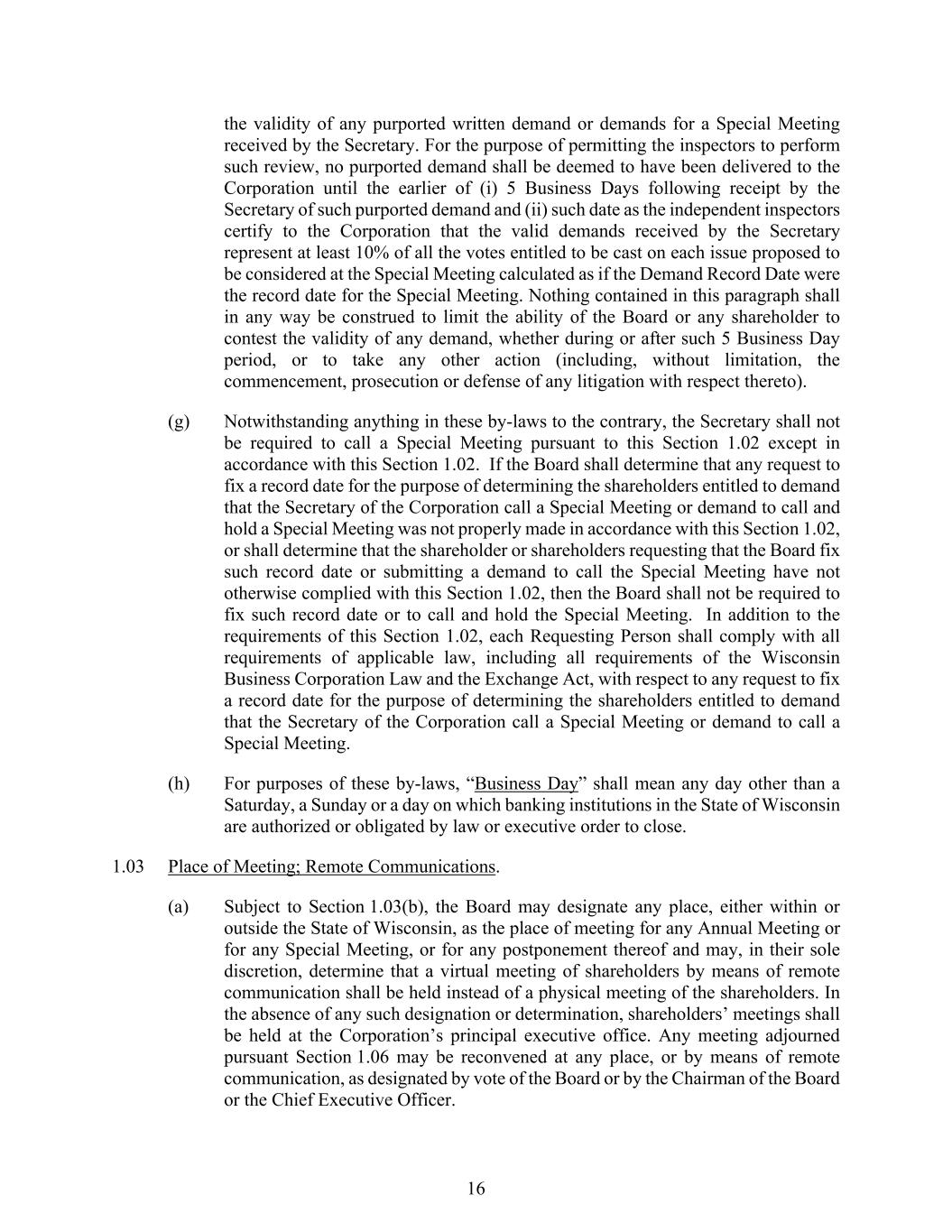 16 the validity of any purported written demand or demands for a Special Meeting received by the Secretary. For the purpose of permitting the inspectors to perform such review, no purported demand shall be deemed to have been delivered to the Corporation until the earlier of (i) 5 Business Days following receipt by the Secretary of such purported demand and (ii) such date as the independent inspectors certify to the Corporation that the valid demands received by the Secretary represent at least 10% of all the votes entitled to be cast on each issue proposed to be considered at the Special Meeting calculated as if the Demand Record Date were the record date for the Special Meeting. Nothing contained in this paragraph shall in any way be construed to limit the ability of the Board or any shareholder to contest the validity of any demand, whether during or after such 5 Business Day period, or to take any other action (including, without limitation, the commencement, prosecution or defense of any litigation with respect thereto). (g) Notwithstanding anything in these by-laws to the contrary, the Secretary shall not be required to call a Special Meeting pursuant to this Section 1.02 except in accordance with this Section 1.02. If the Board shall determine that any request to fix a record date for the purpose of determining the shareholders entitled to demand that the Secretary of the Corporation call a Special Meeting or demand to call and hold a Special Meeting was not properly made in accordance with this Section 1.02, or shall determine that the shareholder or shareholders requesting that the Board fix such record date or submitting a demand to call the Special Meeting have not otherwise complied with this Section 1.02, then the Board shall not be required to fix such record date or to call and hold the Special Meeting. In addition to the requirements of this Section 1.02, each Requesting Person shall comply with all requirements of applicable law, including all requirements of the Wisconsin Business Corporation Law and the Exchange Act, with respect to any request to fix a record date for the purpose of determining the shareholders entitled to demand that the Secretary of the Corporation call a Special Meeting or demand to call a Special Meeting. (h) For purposes of these by-laws, “Business Day” shall mean any day other than a Saturday, a Sunday or a day on which banking institutions in the State of Wisconsin are authorized or obligated by law or executive order to close. 1.03 Place of Meeting; Remote Communications. (a) Subject to Section 1.03(b), the Board may designate any place, either within or outside the State of Wisconsin, as the place of meeting for any Annual Meeting or for any Special Meeting, or for any postponement thereof and may, in their sole discretion, determine that a virtual meeting of shareholders by means of remote communication shall be held instead of a physical meeting of the shareholders. In the absence of any such designation or determination, shareholders’ meetings shall be held at the Corporation’s principal executive office. Any meeting adjourned pursuant Section 1.06 may be reconvened at any place, or by means of remote communication, as designated by vote of the Board or by the Chairman of the Board or the Chief Executive Officer.