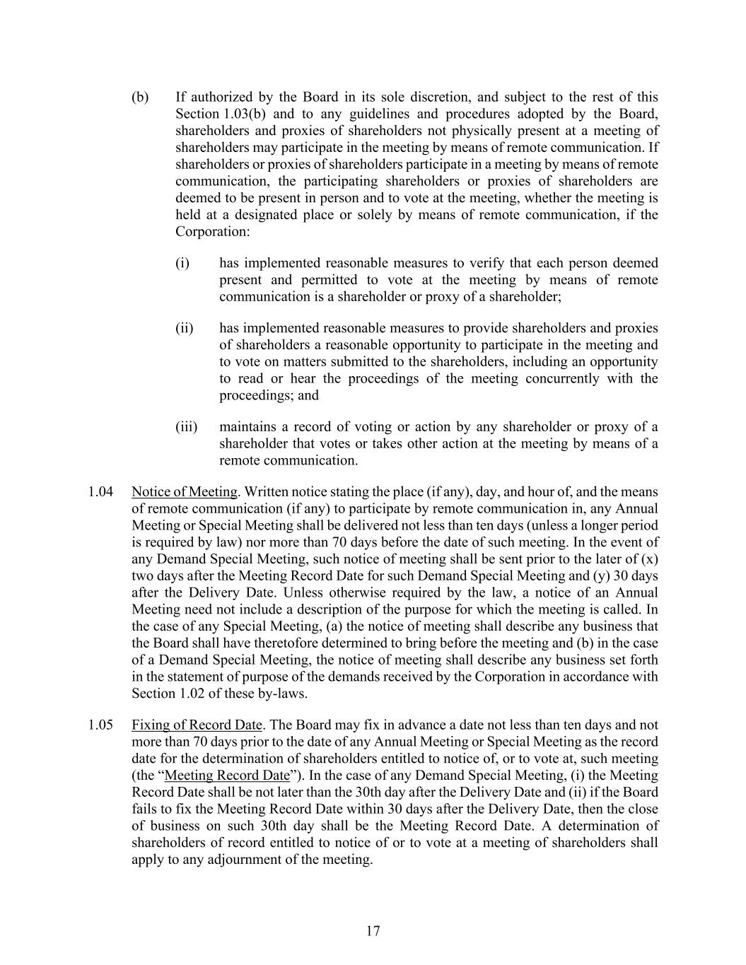 17 (b) If authorized by the Board in its sole discretion, and subject to the rest of this Section 1.03(b) and to any guidelines and procedures adopted by the Board, shareholders and proxies of shareholders not physically present at a meeting of shareholders may participate in the meeting by means of remote communication. If shareholders or proxies of shareholders participate in a meeting by means of remote communication, the participating shareholders or proxies of shareholders are deemed to be present in person and to vote at the meeting, whether the meeting is held at a designated place or solely by means of remote communication, if the Corporation: (i) has implemented reasonable measures to verify that each person deemed present and permitted to vote at the meeting by means of remote communication is a shareholder or proxy of a shareholder; (ii) has implemented reasonable measures to provide shareholders and proxies of shareholders a reasonable opportunity to participate in the meeting and to vote on matters submitted to the shareholders, including an opportunity to read or hear the proceedings of the meeting concurrently with the proceedings; and (iii) maintains a record of voting or action by any shareholder or proxy of a shareholder that votes or takes other action at the meeting by means of a remote communication. 1.04 Notice of Meeting. Written notice stating the place (if any), day, and hour of, and the means of remote communication (if any) to participate by remote communication in, any Annual Meeting or Special Meeting shall be delivered not less than ten days (unless a longer period is required by law) nor more than 70 days before the date of such meeting. In the event of any Demand Special Meeting, such notice of meeting shall be sent prior to the later of (x) two days after the Meeting Record Date for such Demand Special Meeting and (y) 30 days after the Delivery Date. Unless otherwise required by the law, a notice of an Annual Meeting need not include a description of the purpose for which the meeting is called. In the case of any Special Meeting, (a) the notice of meeting shall describe any business that the Board shall have theretofore determined to bring before the meeting and (b) in the case of a Demand Special Meeting, the notice of meeting shall describe any business set forth in the statement of purpose of the demands received by the Corporation in accordance with Section 1.02 of these by-laws. 1.05 Fixing of Record Date. The Board may fix in advance a date not less than ten days and not more than 70 days prior to the date of any Annual Meeting or Special Meeting as the record date for the determination of shareholders entitled to notice of, or to vote at, such meeting (the “Meeting Record Date”). In the case of any Demand Special Meeting, (i) the Meeting Record Date shall be not later than the 30th day after the Delivery Date and (ii) if the Board fails to fix the Meeting Record Date within 30 days after the Delivery Date, then the close of business on such 30th day shall be the Meeting Record Date. A determination of shareholders of record entitled to notice of or to vote at a meeting of shareholders shall apply to any adjournment of the meeting.