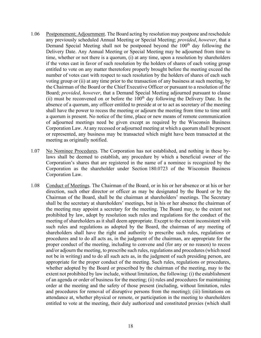 18 1.06 Postponement; Adjournment. The Board acting by resolution may postpone and reschedule any previously scheduled Annual Meeting or Special Meeting; provided, however, that a Demand Special Meeting shall not be postponed beyond the 100th day following the Delivery Date. Any Annual Meeting or Special Meeting may be adjourned from time to time, whether or not there is a quorum, (i) at any time, upon a resolution by shareholders if the votes cast in favor of such resolution by the holders of shares of each voting group entitled to vote on any matter theretofore properly brought before the meeting exceed the number of votes cast with respect to such resolution by the holders of shares of each such voting group or (ii) at any time prior to the transaction of any business at such meeting, by the Chairman of the Board or the Chief Executive Officer or pursuant to a resolution of the Board; provided, however, that a Demand Special Meeting adjourned pursuant to clause (ii) must be reconvened on or before the 100th day following the Delivery Date. In the absence of a quorum, any officer entitled to preside at or to act as secretary of the meeting shall have the power to recess the meeting or adjourn the meeting from time to time until a quorum is present. No notice of the time, place or new means of remote communication of adjourned meetings need be given except as required by the Wisconsin Business Corporation Law. At any recessed or adjourned meeting at which a quorum shall be present or represented, any business may be transacted which might have been transacted at the meeting as originally notified. 1.07 No Nominee Procedures. The Corporation has not established, and nothing in these by- laws shall be deemed to establish, any procedure by which a beneficial owner of the Corporation’s shares that are registered in the name of a nominee is recognized by the Corporation as the shareholder under Section 180.0723 of the Wisconsin Business Corporation Law. 1.08 Conduct of Meetings. The Chairman of the Board, or in his or her absence or at his or her direction, such other director or officer as may be designated by the Board or by the Chairman of the Board, shall be the chairman at shareholders’ meetings. The Secretary shall be the secretary at shareholders’ meetings, but in his or her absence the chairman of the meeting may appoint a secretary for the meeting. The Board may, to the extent not prohibited by law, adopt by resolution such rules and regulations for the conduct of the meeting of shareholders as it shall deem appropriate. Except to the extent inconsistent with such rules and regulations as adopted by the Board, the chairman of any meeting of shareholders shall have the right and authority to prescribe such rules, regulations or procedures and to do all acts as, in the judgment of the chairman, are appropriate for the proper conduct of the meeting, including to convene and (for any or no reason) to recess and/or adjourn the meeting, to prescribe such rules, regulations and procedures (which need not be in writing) and to do all such acts as, in the judgment of such presiding person, are appropriate for the proper conduct of the meeting. Such rules, regulations or procedures, whether adopted by the Board or prescribed by the chairman of the meeting, may to the extent not prohibited by law include, without limitation, the following: (i) the establishment of an agenda or order of business for the meeting; (ii) rules and procedures for maintaining order at the meeting and the safety of those present (including, without limitation, rules and procedures for removal of disruptive persons from the meeting); (iii) limitations on attendance at, whether physical or remote, or participation in the meeting to shareholders entitled to vote at the meeting, their duly authorized and constituted proxies (which shall