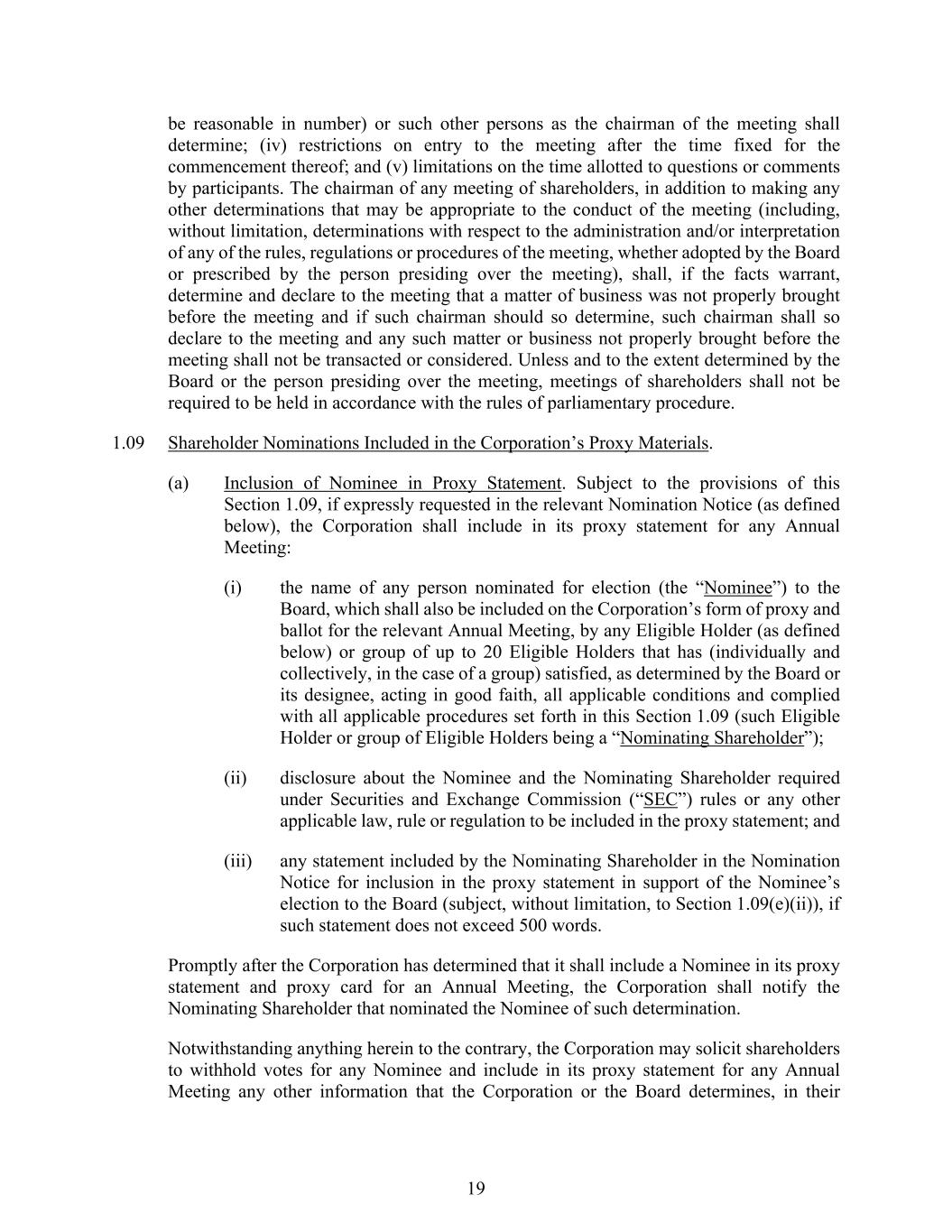 19 be reasonable in number) or such other persons as the chairman of the meeting shall determine; (iv) restrictions on entry to the meeting after the time fixed for the commencement thereof; and (v) limitations on the time allotted to questions or comments by participants. The chairman of any meeting of shareholders, in addition to making any other determinations that may be appropriate to the conduct of the meeting (including, without limitation, determinations with respect to the administration and/or interpretation of any of the rules, regulations or procedures of the meeting, whether adopted by the Board or prescribed by the person presiding over the meeting), shall, if the facts warrant, determine and declare to the meeting that a matter of business was not properly brought before the meeting and if such chairman should so determine, such chairman shall so declare to the meeting and any such matter or business not properly brought before the meeting shall not be transacted or considered. Unless and to the extent determined by the Board or the person presiding over the meeting, meetings of shareholders shall not be required to be held in accordance with the rules of parliamentary procedure. 1.09 Shareholder Nominations Included in the Corporation’s Proxy Materials. (a) Inclusion of Nominee in Proxy Statement. Subject to the provisions of this Section 1.09, if expressly requested in the relevant Nomination Notice (as defined below), the Corporation shall include in its proxy statement for any Annual Meeting: (i) the name of any person nominated for election (the “Nominee”) to the Board, which shall also be included on the Corporation’s form of proxy and ballot for the relevant Annual Meeting, by any Eligible Holder (as defined below) or group of up to 20 Eligible Holders that has (individually and collectively, in the case of a group) satisfied, as determined by the Board or its designee, acting in good faith, all applicable conditions and complied with all applicable procedures set forth in this Section 1.09 (such Eligible Holder or group of Eligible Holders being a “Nominating Shareholder”); (ii) disclosure about the Nominee and the Nominating Shareholder required under Securities and Exchange Commission (“SEC”) rules or any other applicable law, rule or regulation to be included in the proxy statement; and (iii) any statement included by the Nominating Shareholder in the Nomination Notice for inclusion in the proxy statement in support of the Nominee’s election to the Board (subject, without limitation, to Section 1.09(e)(ii)), if such statement does not exceed 500 words. Promptly after the Corporation has determined that it shall include a Nominee in its proxy statement and proxy card for an Annual Meeting, the Corporation shall notify the Nominating Shareholder that nominated the Nominee of such determination. Notwithstanding anything herein to the contrary, the Corporation may solicit shareholders to withhold votes for any Nominee and include in its proxy statement for any Annual Meeting any other information that the Corporation or the Board determines, in their