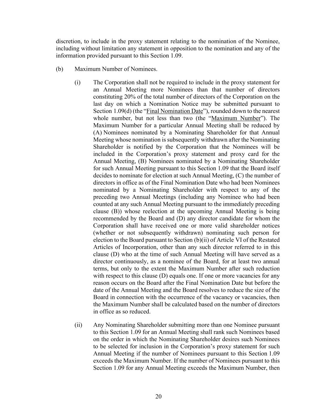 20 discretion, to include in the proxy statement relating to the nomination of the Nominee, including without limitation any statement in opposition to the nomination and any of the information provided pursuant to this Section 1.09. (b) Maximum Number of Nominees. (i) The Corporation shall not be required to include in the proxy statement for an Annual Meeting more Nominees than that number of directors constituting 20% of the total number of directors of the Corporation on the last day on which a Nomination Notice may be submitted pursuant to Section 1.09(d) (the “Final Nomination Date”), rounded down to the nearest whole number, but not less than two (the “Maximum Number”). The Maximum Number for a particular Annual Meeting shall be reduced by (A) Nominees nominated by a Nominating Shareholder for that Annual Meeting whose nomination is subsequently withdrawn after the Nominating Shareholder is notified by the Corporation that the Nominees will be included in the Corporation’s proxy statement and proxy card for the Annual Meeting, (B) Nominees nominated by a Nominating Shareholder for such Annual Meeting pursuant to this Section 1.09 that the Board itself decides to nominate for election at such Annual Meeting, (C) the number of directors in office as of the Final Nomination Date who had been Nominees nominated by a Nominating Shareholder with respect to any of the preceding two Annual Meetings (including any Nominee who had been counted at any such Annual Meeting pursuant to the immediately preceding clause (B)) whose reelection at the upcoming Annual Meeting is being recommended by the Board and (D) any director candidate for whom the Corporation shall have received one or more valid shareholder notices (whether or not subsequently withdrawn) nominating such person for election to the Board pursuant to Section (b)(ii) of Article VI of the Restated Articles of Incorporation, other than any such director referred to in this clause (D) who at the time of such Annual Meeting will have served as a director continuously, as a nominee of the Board, for at least two annual terms, but only to the extent the Maximum Number after such reduction with respect to this clause (D) equals one. If one or more vacancies for any reason occurs on the Board after the Final Nomination Date but before the date of the Annual Meeting and the Board resolves to reduce the size of the Board in connection with the occurrence of the vacancy or vacancies, then the Maximum Number shall be calculated based on the number of directors in office as so reduced. (ii) Any Nominating Shareholder submitting more than one Nominee pursuant to this Section 1.09 for an Annual Meeting shall rank such Nominees based on the order in which the Nominating Shareholder desires such Nominees to be selected for inclusion in the Corporation’s proxy statement for such Annual Meeting if the number of Nominees pursuant to this Section 1.09 exceeds the Maximum Number. If the number of Nominees pursuant to this Section 1.09 for any Annual Meeting exceeds the Maximum Number, then