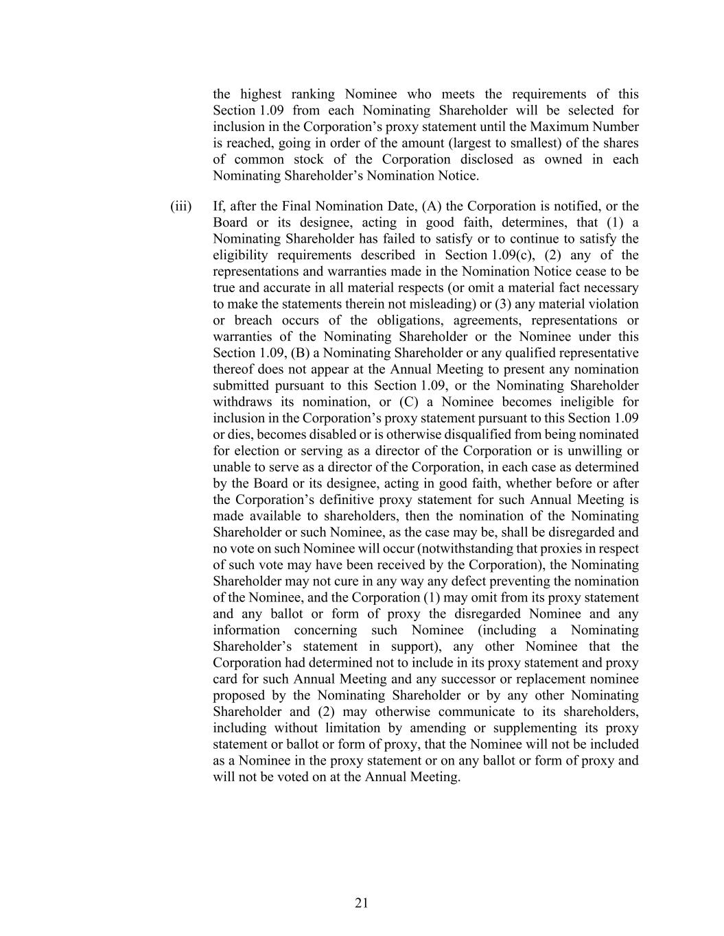 21 the highest ranking Nominee who meets the requirements of this Section 1.09 from each Nominating Shareholder will be selected for inclusion in the Corporation’s proxy statement until the Maximum Number is reached, going in order of the amount (largest to smallest) of the shares of common stock of the Corporation disclosed as owned in each Nominating Shareholder’s Nomination Notice. (iii) If, after the Final Nomination Date, (A) the Corporation is notified, or the Board or its designee, acting in good faith, determines, that (1) a Nominating Shareholder has failed to satisfy or to continue to satisfy the eligibility requirements described in Section 1.09(c), (2) any of the representations and warranties made in the Nomination Notice cease to be true and accurate in all material respects (or omit a material fact necessary to make the statements therein not misleading) or (3) any material violation or breach occurs of the obligations, agreements, representations or warranties of the Nominating Shareholder or the Nominee under this Section 1.09, (B) a Nominating Shareholder or any qualified representative thereof does not appear at the Annual Meeting to present any nomination submitted pursuant to this Section 1.09, or the Nominating Shareholder withdraws its nomination, or (C) a Nominee becomes ineligible for inclusion in the Corporation’s proxy statement pursuant to this Section 1.09 or dies, becomes disabled or is otherwise disqualified from being nominated for election or serving as a director of the Corporation or is unwilling or unable to serve as a director of the Corporation, in each case as determined by the Board or its designee, acting in good faith, whether before or after the Corporation’s definitive proxy statement for such Annual Meeting is made available to shareholders, then the nomination of the Nominating Shareholder or such Nominee, as the case may be, shall be disregarded and no vote on such Nominee will occur (notwithstanding that proxies in respect of such vote may have been received by the Corporation), the Nominating Shareholder may not cure in any way any defect preventing the nomination of the Nominee, and the Corporation (1) may omit from its proxy statement and any ballot or form of proxy the disregarded Nominee and any information concerning such Nominee (including a Nominating Shareholder’s statement in support), any other Nominee that the Corporation had determined not to include in its proxy statement and proxy card for such Annual Meeting and any successor or replacement nominee proposed by the Nominating Shareholder or by any other Nominating Shareholder and (2) may otherwise communicate to its shareholders, including without limitation by amending or supplementing its proxy statement or ballot or form of proxy, that the Nominee will not be included as a Nominee in the proxy statement or on any ballot or form of proxy and will not be voted on at the Annual Meeting.