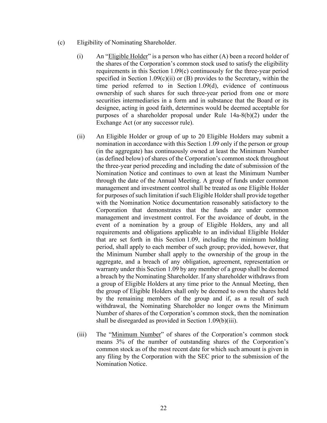 22 (c) Eligibility of Nominating Shareholder. (i) An “Eligible Holder” is a person who has either (A) been a record holder of the shares of the Corporation’s common stock used to satisfy the eligibility requirements in this Section 1.09(c) continuously for the three-year period specified in Section 1.09(c)(ii) or (B) provides to the Secretary, within the time period referred to in Section 1.09(d), evidence of continuous ownership of such shares for such three-year period from one or more securities intermediaries in a form and in substance that the Board or its designee, acting in good faith, determines would be deemed acceptable for purposes of a shareholder proposal under Rule 14a-8(b)(2) under the Exchange Act (or any successor rule). (ii) An Eligible Holder or group of up to 20 Eligible Holders may submit a nomination in accordance with this Section 1.09 only if the person or group (in the aggregate) has continuously owned at least the Minimum Number (as defined below) of shares of the Corporation’s common stock throughout the three-year period preceding and including the date of submission of the Nomination Notice and continues to own at least the Minimum Number through the date of the Annual Meeting. A group of funds under common management and investment control shall be treated as one Eligible Holder for purposes of such limitation if such Eligible Holder shall provide together with the Nomination Notice documentation reasonably satisfactory to the Corporation that demonstrates that the funds are under common management and investment control. For the avoidance of doubt, in the event of a nomination by a group of Eligible Holders, any and all requirements and obligations applicable to an individual Eligible Holder that are set forth in this Section 1.09, including the minimum holding period, shall apply to each member of such group; provided, however, that the Minimum Number shall apply to the ownership of the group in the aggregate, and a breach of any obligation, agreement, representation or warranty under this Section 1.09 by any member of a group shall be deemed a breach by the Nominating Shareholder. If any shareholder withdraws from a group of Eligible Holders at any time prior to the Annual Meeting, then the group of Eligible Holders shall only be deemed to own the shares held by the remaining members of the group and if, as a result of such withdrawal, the Nominating Shareholder no longer owns the Minimum Number of shares of the Corporation’s common stock, then the nomination shall be disregarded as provided in Section 1.09(b)(iii). (iii) The “Minimum Number” of shares of the Corporation’s common stock means 3% of the number of outstanding shares of the Corporation’s common stock as of the most recent date for which such amount is given in any filing by the Corporation with the SEC prior to the submission of the Nomination Notice.