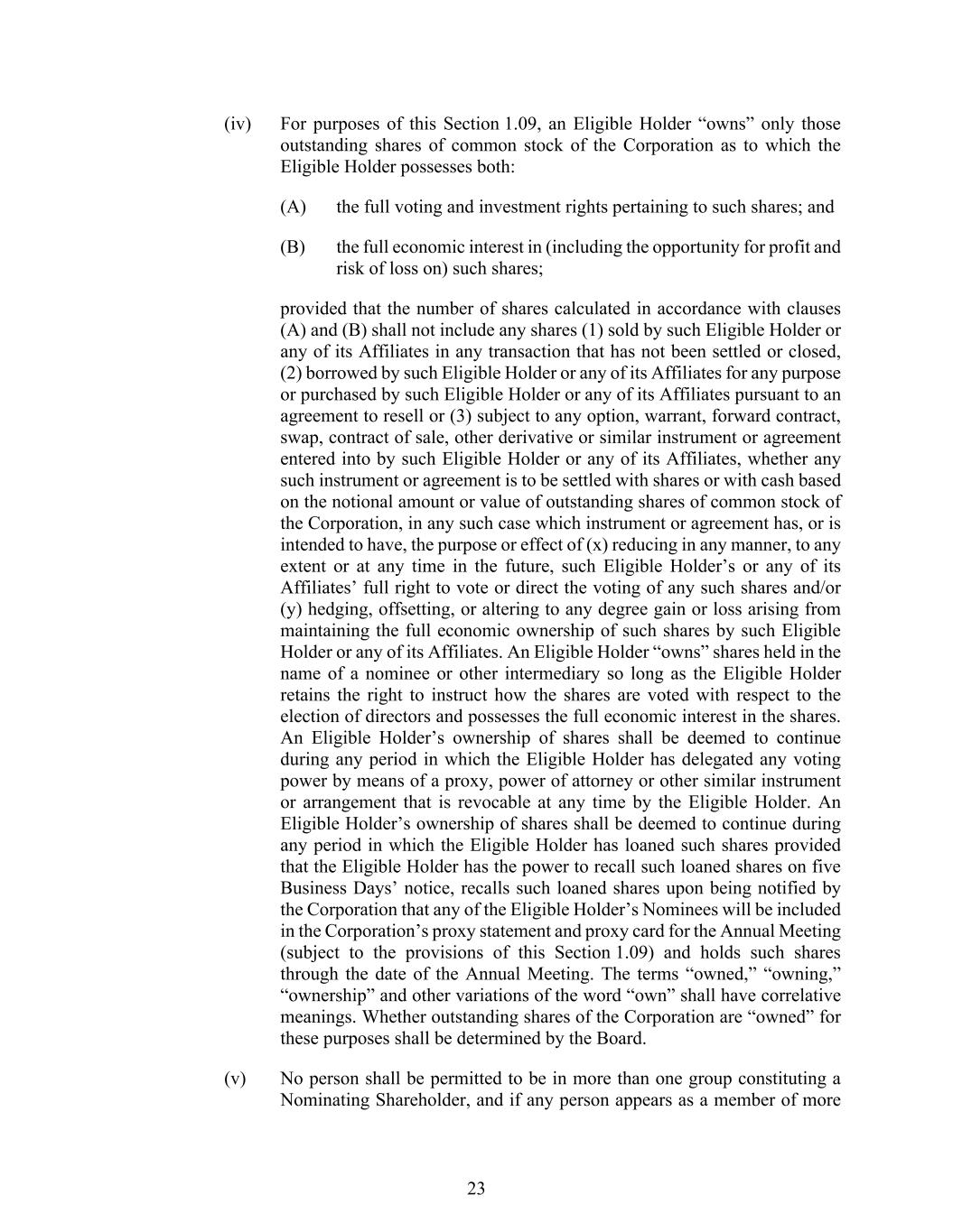 23 (iv) For purposes of this Section 1.09, an Eligible Holder “owns” only those outstanding shares of common stock of the Corporation as to which the Eligible Holder possesses both: (A) the full voting and investment rights pertaining to such shares; and (B) the full economic interest in (including the opportunity for profit and risk of loss on) such shares; provided that the number of shares calculated in accordance with clauses (A) and (B) shall not include any shares (1) sold by such Eligible Holder or any of its Affiliates in any transaction that has not been settled or closed, (2) borrowed by such Eligible Holder or any of its Affiliates for any purpose or purchased by such Eligible Holder or any of its Affiliates pursuant to an agreement to resell or (3) subject to any option, warrant, forward contract, swap, contract of sale, other derivative or similar instrument or agreement entered into by such Eligible Holder or any of its Affiliates, whether any such instrument or agreement is to be settled with shares or with cash based on the notional amount or value of outstanding shares of common stock of the Corporation, in any such case which instrument or agreement has, or is intended to have, the purpose or effect of (x) reducing in any manner, to any extent or at any time in the future, such Eligible Holder’s or any of its Affiliates’ full right to vote or direct the voting of any such shares and/or (y) hedging, offsetting, or altering to any degree gain or loss arising from maintaining the full economic ownership of such shares by such Eligible Holder or any of its Affiliates. An Eligible Holder “owns” shares held in the name of a nominee or other intermediary so long as the Eligible Holder retains the right to instruct how the shares are voted with respect to the election of directors and possesses the full economic interest in the shares. An Eligible Holder’s ownership of shares shall be deemed to continue during any period in which the Eligible Holder has delegated any voting power by means of a proxy, power of attorney or other similar instrument or arrangement that is revocable at any time by the Eligible Holder. An Eligible Holder’s ownership of shares shall be deemed to continue during any period in which the Eligible Holder has loaned such shares provided that the Eligible Holder has the power to recall such loaned shares on five Business Days’ notice, recalls such loaned shares upon being notified by the Corporation that any of the Eligible Holder’s Nominees will be included in the Corporation’s proxy statement and proxy card for the Annual Meeting (subject to the provisions of this Section 1.09) and holds such shares through the date of the Annual Meeting. The terms “owned,” “owning,” “ownership” and other variations of the word “own” shall have correlative meanings. Whether outstanding shares of the Corporation are “owned” for these purposes shall be determined by the Board. (v) No person shall be permitted to be in more than one group constituting a Nominating Shareholder, and if any person appears as a member of more