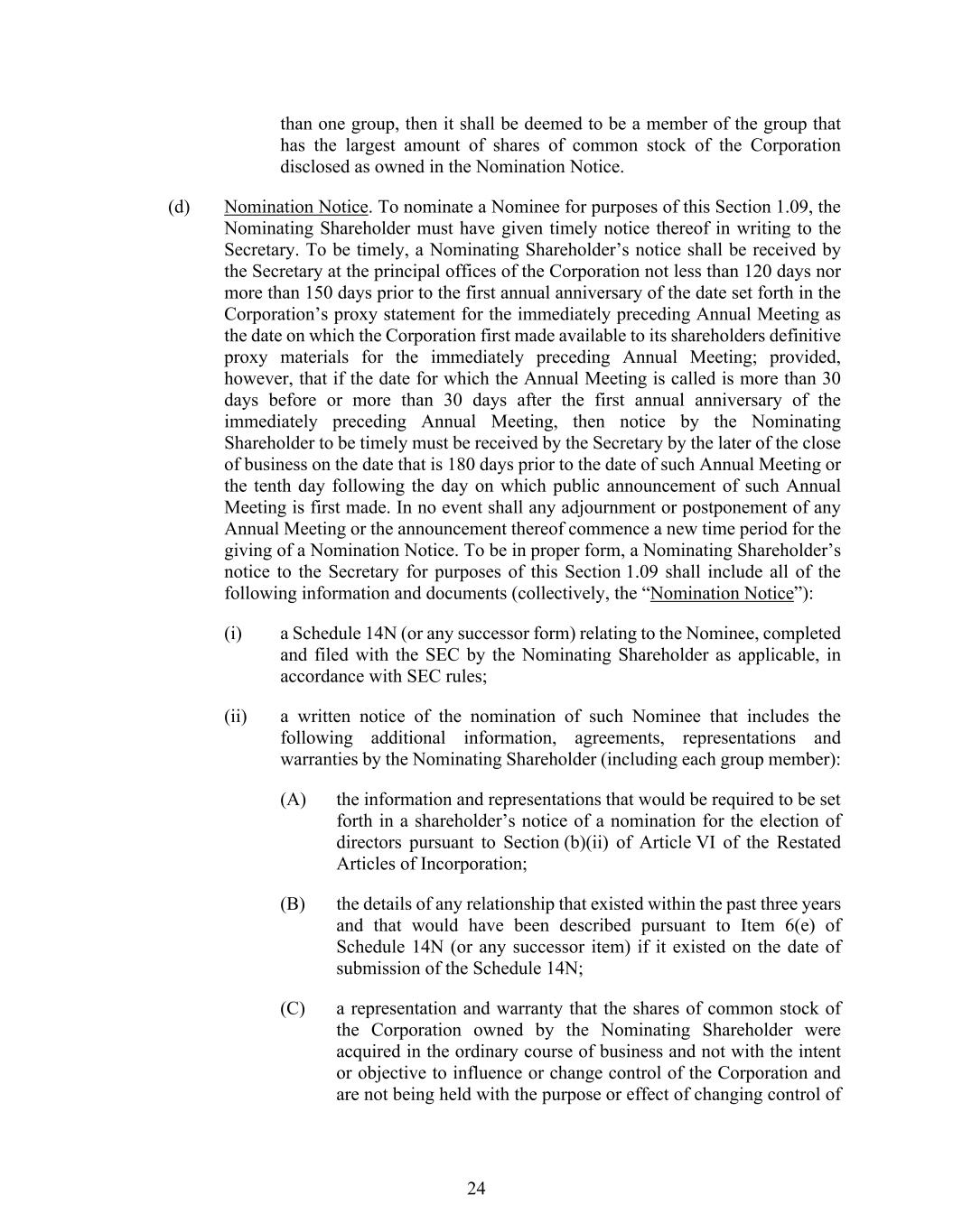 24 than one group, then it shall be deemed to be a member of the group that has the largest amount of shares of common stock of the Corporation disclosed as owned in the Nomination Notice. (d) Nomination Notice. To nominate a Nominee for purposes of this Section 1.09, the Nominating Shareholder must have given timely notice thereof in writing to the Secretary. To be timely, a Nominating Shareholder’s notice shall be received by the Secretary at the principal offices of the Corporation not less than 120 days nor more than 150 days prior to the first annual anniversary of the date set forth in the Corporation’s proxy statement for the immediately preceding Annual Meeting as the date on which the Corporation first made available to its shareholders definitive proxy materials for the immediately preceding Annual Meeting; provided, however, that if the date for which the Annual Meeting is called is more than 30 days before or more than 30 days after the first annual anniversary of the immediately preceding Annual Meeting, then notice by the Nominating Shareholder to be timely must be received by the Secretary by the later of the close of business on the date that is 180 days prior to the date of such Annual Meeting or the tenth day following the day on which public announcement of such Annual Meeting is first made. In no event shall any adjournment or postponement of any Annual Meeting or the announcement thereof commence a new time period for the giving of a Nomination Notice. To be in proper form, a Nominating Shareholder’s notice to the Secretary for purposes of this Section 1.09 shall include all of the following information and documents (collectively, the “Nomination Notice”): (i) a Schedule 14N (or any successor form) relating to the Nominee, completed and filed with the SEC by the Nominating Shareholder as applicable, in accordance with SEC rules; (ii) a written notice of the nomination of such Nominee that includes the following additional information, agreements, representations and warranties by the Nominating Shareholder (including each group member): (A) the information and representations that would be required to be set forth in a shareholder’s notice of a nomination for the election of directors pursuant to Section (b)(ii) of Article VI of the Restated Articles of Incorporation; (B) the details of any relationship that existed within the past three years and that would have been described pursuant to Item 6(e) of Schedule 14N (or any successor item) if it existed on the date of submission of the Schedule 14N; (C) a representation and warranty that the shares of common stock of the Corporation owned by the Nominating Shareholder were acquired in the ordinary course of business and not with the intent or objective to influence or change control of the Corporation and are not being held with the purpose or effect of changing control of
