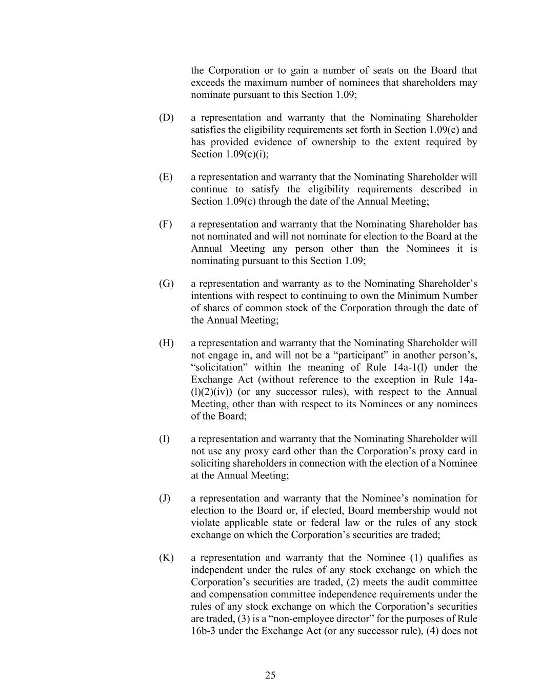 25 the Corporation or to gain a number of seats on the Board that exceeds the maximum number of nominees that shareholders may nominate pursuant to this Section 1.09; (D) a representation and warranty that the Nominating Shareholder satisfies the eligibility requirements set forth in Section 1.09(c) and has provided evidence of ownership to the extent required by Section 1.09(c)(i); (E) a representation and warranty that the Nominating Shareholder will continue to satisfy the eligibility requirements described in Section 1.09(c) through the date of the Annual Meeting; (F) a representation and warranty that the Nominating Shareholder has not nominated and will not nominate for election to the Board at the Annual Meeting any person other than the Nominees it is nominating pursuant to this Section 1.09; (G) a representation and warranty as to the Nominating Shareholder’s intentions with respect to continuing to own the Minimum Number of shares of common stock of the Corporation through the date of the Annual Meeting; (H) a representation and warranty that the Nominating Shareholder will not engage in, and will not be a “participant” in another person’s, “solicitation” within the meaning of Rule 14a-1(l) under the Exchange Act (without reference to the exception in Rule 14a- (l)(2)(iv)) (or any successor rules), with respect to the Annual Meeting, other than with respect to its Nominees or any nominees of the Board; (I) a representation and warranty that the Nominating Shareholder will not use any proxy card other than the Corporation’s proxy card in soliciting shareholders in connection with the election of a Nominee at the Annual Meeting; (J) a representation and warranty that the Nominee’s nomination for election to the Board or, if elected, Board membership would not violate applicable state or federal law or the rules of any stock exchange on which the Corporation’s securities are traded; (K) a representation and warranty that the Nominee (1) qualifies as independent under the rules of any stock exchange on which the Corporation’s securities are traded, (2) meets the audit committee and compensation committee independence requirements under the rules of any stock exchange on which the Corporation’s securities are traded, (3) is a “non-employee director” for the purposes of Rule 16b-3 under the Exchange Act (or any successor rule), (4) does not