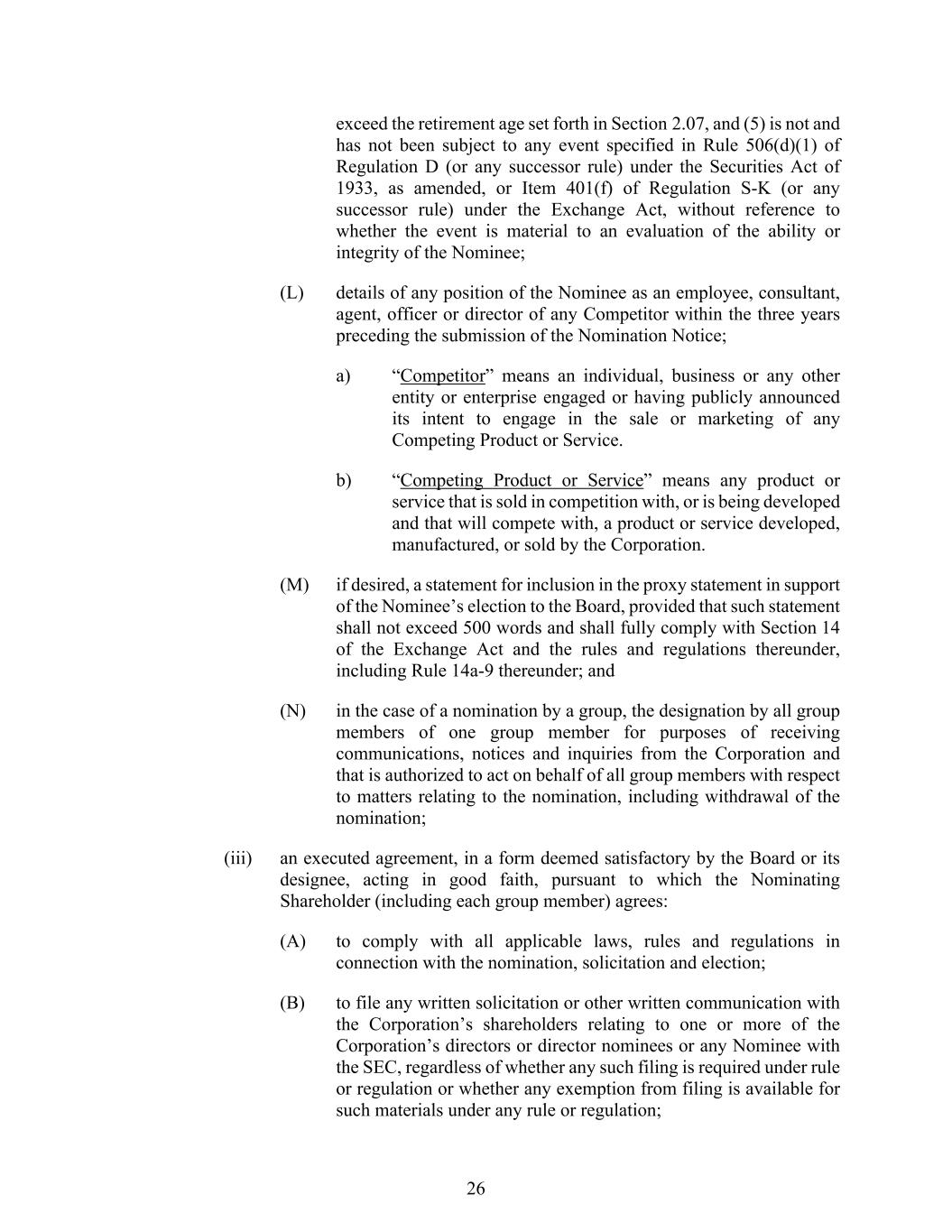 26 exceed the retirement age set forth in Section 2.07, and (5) is not and has not been subject to any event specified in Rule 506(d)(1) of Regulation D (or any successor rule) under the Securities Act of 1933, as amended, or Item 401(f) of Regulation S-K (or any successor rule) under the Exchange Act, without reference to whether the event is material to an evaluation of the ability or integrity of the Nominee; (L) details of any position of the Nominee as an employee, consultant, agent, officer or director of any Competitor within the three years preceding the submission of the Nomination Notice; a) “Competitor” means an individual, business or any other entity or enterprise engaged or having publicly announced its intent to engage in the sale or marketing of any Competing Product or Service. b) “Competing Product or Service” means any product or service that is sold in competition with, or is being developed and that will compete with, a product or service developed, manufactured, or sold by the Corporation. (M) if desired, a statement for inclusion in the proxy statement in support of the Nominee’s election to the Board, provided that such statement shall not exceed 500 words and shall fully comply with Section 14 of the Exchange Act and the rules and regulations thereunder, including Rule 14a-9 thereunder; and (N) in the case of a nomination by a group, the designation by all group members of one group member for purposes of receiving communications, notices and inquiries from the Corporation and that is authorized to act on behalf of all group members with respect to matters relating to the nomination, including withdrawal of the nomination; (iii) an executed agreement, in a form deemed satisfactory by the Board or its designee, acting in good faith, pursuant to which the Nominating Shareholder (including each group member) agrees: (A) to comply with all applicable laws, rules and regulations in connection with the nomination, solicitation and election; (B) to file any written solicitation or other written communication with the Corporation’s shareholders relating to one or more of the Corporation’s directors or director nominees or any Nominee with the SEC, regardless of whether any such filing is required under rule or regulation or whether any exemption from filing is available for such materials under any rule or regulation;