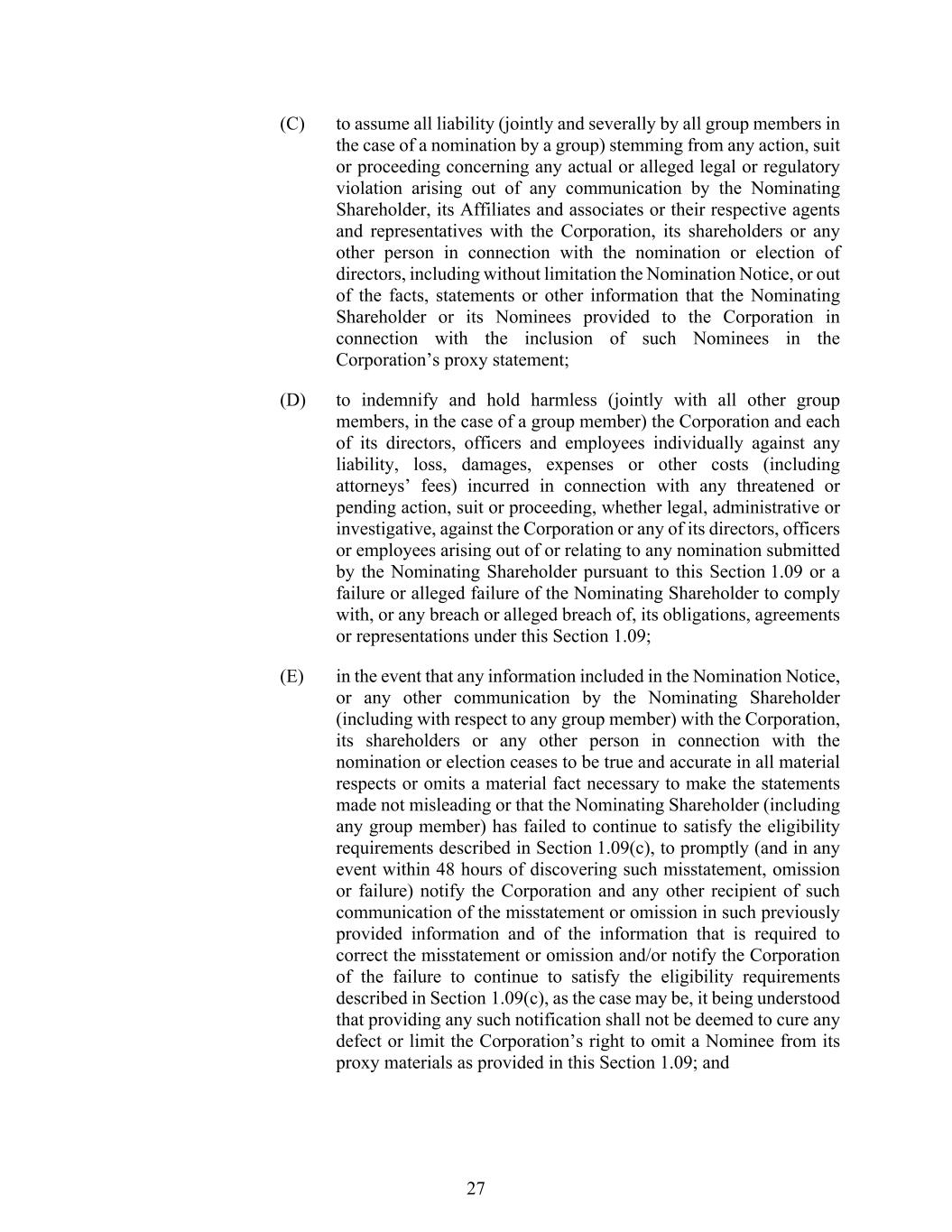 27 (C) to assume all liability (jointly and severally by all group members in the case of a nomination by a group) stemming from any action, suit or proceeding concerning any actual or alleged legal or regulatory violation arising out of any communication by the Nominating Shareholder, its Affiliates and associates or their respective agents and representatives with the Corporation, its shareholders or any other person in connection with the nomination or election of directors, including without limitation the Nomination Notice, or out of the facts, statements or other information that the Nominating Shareholder or its Nominees provided to the Corporation in connection with the inclusion of such Nominees in the Corporation’s proxy statement; (D) to indemnify and hold harmless (jointly with all other group members, in the case of a group member) the Corporation and each of its directors, officers and employees individually against any liability, loss, damages, expenses or other costs (including attorneys’ fees) incurred in connection with any threatened or pending action, suit or proceeding, whether legal, administrative or investigative, against the Corporation or any of its directors, officers or employees arising out of or relating to any nomination submitted by the Nominating Shareholder pursuant to this Section 1.09 or a failure or alleged failure of the Nominating Shareholder to comply with, or any breach or alleged breach of, its obligations, agreements or representations under this Section 1.09; (E) in the event that any information included in the Nomination Notice, or any other communication by the Nominating Shareholder (including with respect to any group member) with the Corporation, its shareholders or any other person in connection with the nomination or election ceases to be true and accurate in all material respects or omits a material fact necessary to make the statements made not misleading or that the Nominating Shareholder (including any group member) has failed to continue to satisfy the eligibility requirements described in Section 1.09(c), to promptly (and in any event within 48 hours of discovering such misstatement, omission or failure) notify the Corporation and any other recipient of such communication of the misstatement or omission in such previously provided information and of the information that is required to correct the misstatement or omission and/or notify the Corporation of the failure to continue to satisfy the eligibility requirements described in Section 1.09(c), as the case may be, it being understood that providing any such notification shall not be deemed to cure any defect or limit the Corporation’s right to omit a Nominee from its proxy materials as provided in this Section 1.09; and