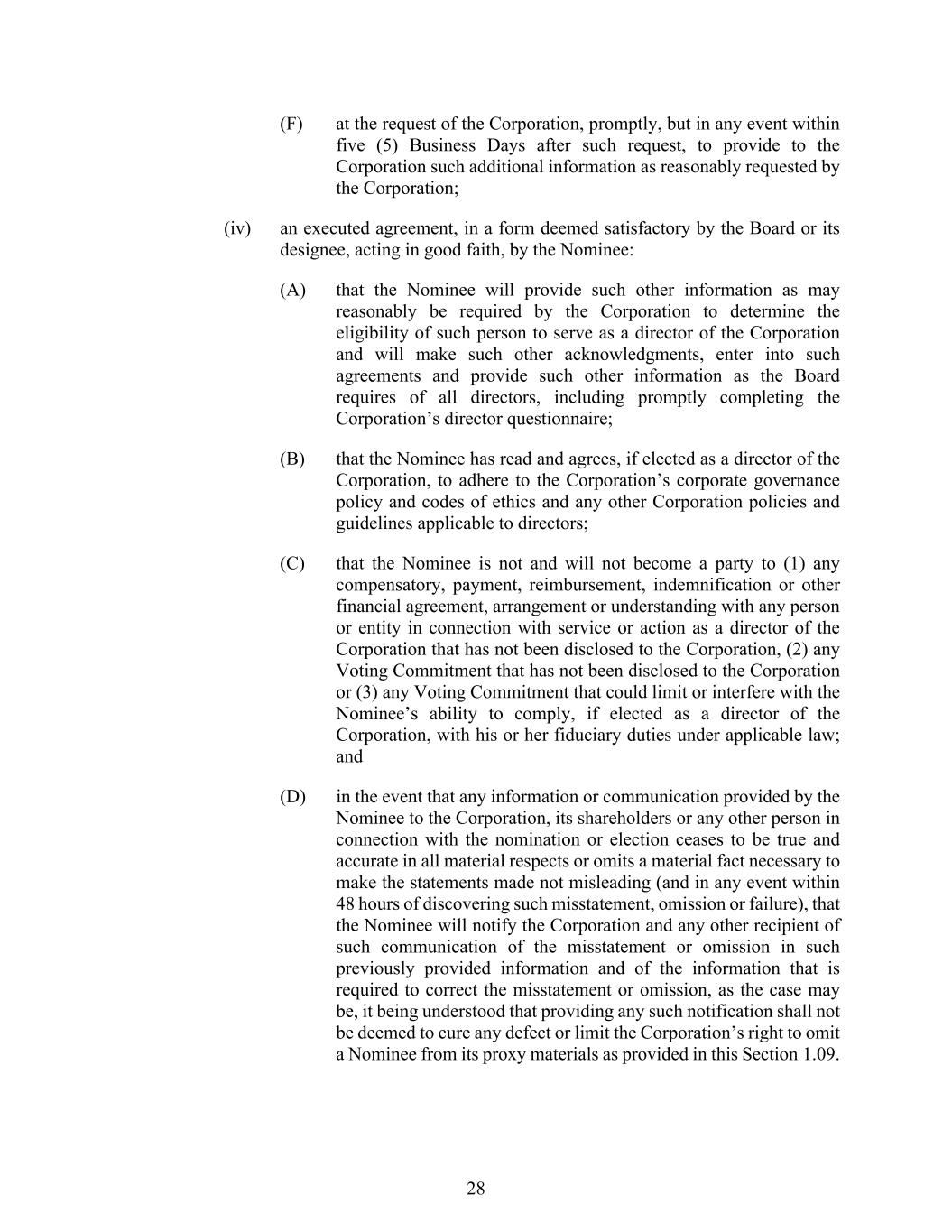 28 (F) at the request of the Corporation, promptly, but in any event within five (5) Business Days after such request, to provide to the Corporation such additional information as reasonably requested by the Corporation; (iv) an executed agreement, in a form deemed satisfactory by the Board or its designee, acting in good faith, by the Nominee: (A) that the Nominee will provide such other information as may reasonably be required by the Corporation to determine the eligibility of such person to serve as a director of the Corporation and will make such other acknowledgments, enter into such agreements and provide such other information as the Board requires of all directors, including promptly completing the Corporation’s director questionnaire; (B) that the Nominee has read and agrees, if elected as a director of the Corporation, to adhere to the Corporation’s corporate governance policy and codes of ethics and any other Corporation policies and guidelines applicable to directors; (C) that the Nominee is not and will not become a party to (1) any compensatory, payment, reimbursement, indemnification or other financial agreement, arrangement or understanding with any person or entity in connection with service or action as a director of the Corporation that has not been disclosed to the Corporation, (2) any Voting Commitment that has not been disclosed to the Corporation or (3) any Voting Commitment that could limit or interfere with the Nominee’s ability to comply, if elected as a director of the Corporation, with his or her fiduciary duties under applicable law; and (D) in the event that any information or communication provided by the Nominee to the Corporation, its shareholders or any other person in connection with the nomination or election ceases to be true and accurate in all material respects or omits a material fact necessary to make the statements made not misleading (and in any event within 48 hours of discovering such misstatement, omission or failure), that the Nominee will notify the Corporation and any other recipient of such communication of the misstatement or omission in such previously provided information and of the information that is required to correct the misstatement or omission, as the case may be, it being understood that providing any such notification shall not be deemed to cure any defect or limit the Corporation’s right to omit a Nominee from its proxy materials as provided in this Section 1.09.