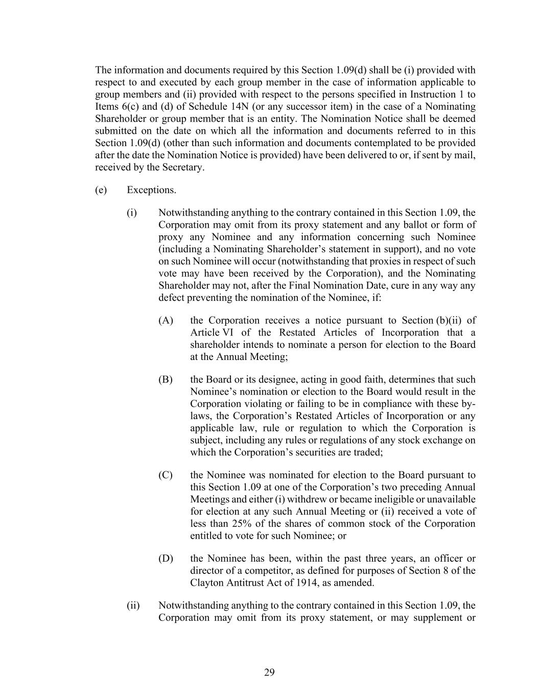 29 The information and documents required by this Section 1.09(d) shall be (i) provided with respect to and executed by each group member in the case of information applicable to group members and (ii) provided with respect to the persons specified in Instruction 1 to Items 6(c) and (d) of Schedule 14N (or any successor item) in the case of a Nominating Shareholder or group member that is an entity. The Nomination Notice shall be deemed submitted on the date on which all the information and documents referred to in this Section 1.09(d) (other than such information and documents contemplated to be provided after the date the Nomination Notice is provided) have been delivered to or, if sent by mail, received by the Secretary. (e) Exceptions. (i) Notwithstanding anything to the contrary contained in this Section 1.09, the Corporation may omit from its proxy statement and any ballot or form of proxy any Nominee and any information concerning such Nominee (including a Nominating Shareholder’s statement in support), and no vote on such Nominee will occur (notwithstanding that proxies in respect of such vote may have been received by the Corporation), and the Nominating Shareholder may not, after the Final Nomination Date, cure in any way any defect preventing the nomination of the Nominee, if: (A) the Corporation receives a notice pursuant to Section (b)(ii) of Article VI of the Restated Articles of Incorporation that a shareholder intends to nominate a person for election to the Board at the Annual Meeting; (B) the Board or its designee, acting in good faith, determines that such Nominee’s nomination or election to the Board would result in the Corporation violating or failing to be in compliance with these by- laws, the Corporation’s Restated Articles of Incorporation or any applicable law, rule or regulation to which the Corporation is subject, including any rules or regulations of any stock exchange on which the Corporation’s securities are traded; (C) the Nominee was nominated for election to the Board pursuant to this Section 1.09 at one of the Corporation’s two preceding Annual Meetings and either (i) withdrew or became ineligible or unavailable for election at any such Annual Meeting or (ii) received a vote of less than 25% of the shares of common stock of the Corporation entitled to vote for such Nominee; or (D) the Nominee has been, within the past three years, an officer or director of a competitor, as defined for purposes of Section 8 of the Clayton Antitrust Act of 1914, as amended. (ii) Notwithstanding anything to the contrary contained in this Section 1.09, the Corporation may omit from its proxy statement, or may supplement or