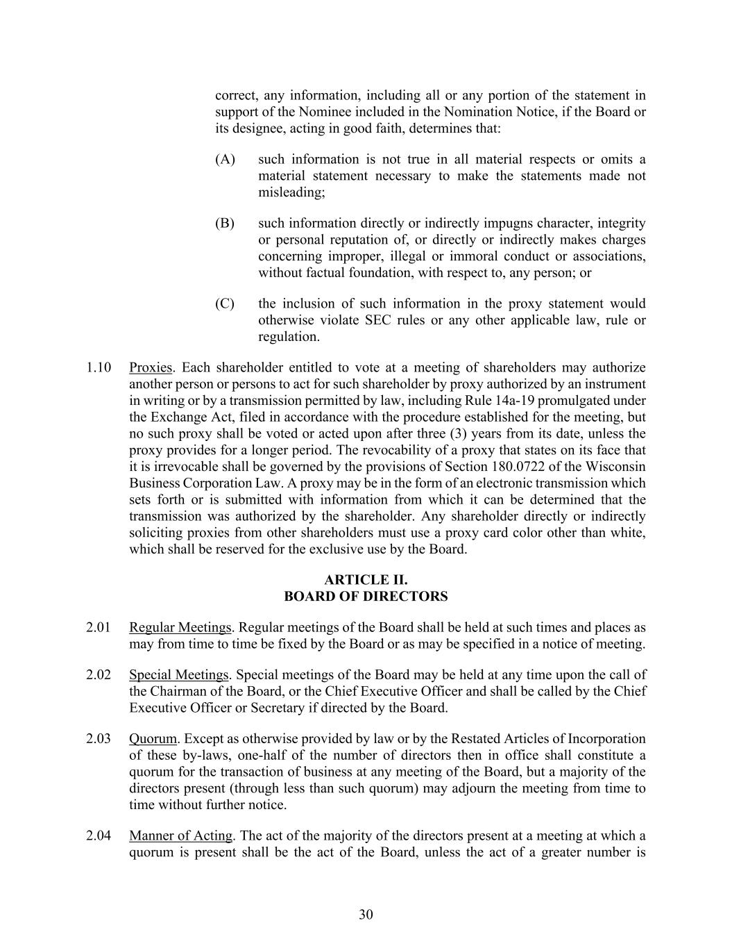 30 correct, any information, including all or any portion of the statement in support of the Nominee included in the Nomination Notice, if the Board or its designee, acting in good faith, determines that: (A) such information is not true in all material respects or omits a material statement necessary to make the statements made not misleading; (B) such information directly or indirectly impugns character, integrity or personal reputation of, or directly or indirectly makes charges concerning improper, illegal or immoral conduct or associations, without factual foundation, with respect to, any person; or (C) the inclusion of such information in the proxy statement would otherwise violate SEC rules or any other applicable law, rule or regulation. 1.10 Proxies. Each shareholder entitled to vote at a meeting of shareholders may authorize another person or persons to act for such shareholder by proxy authorized by an instrument in writing or by a transmission permitted by law, including Rule 14a-19 promulgated under the Exchange Act, filed in accordance with the procedure established for the meeting, but no such proxy shall be voted or acted upon after three (3) years from its date, unless the proxy provides for a longer period. The revocability of a proxy that states on its face that it is irrevocable shall be governed by the provisions of Section 180.0722 of the Wisconsin Business Corporation Law. A proxy may be in the form of an electronic transmission which sets forth or is submitted with information from which it can be determined that the transmission was authorized by the shareholder. Any shareholder directly or indirectly soliciting proxies from other shareholders must use a proxy card color other than white, which shall be reserved for the exclusive use by the Board. ARTICLE II. BOARD OF DIRECTORS 2.01 Regular Meetings. Regular meetings of the Board shall be held at such times and places as may from time to time be fixed by the Board or as may be specified in a notice of meeting. 2.02 Special Meetings. Special meetings of the Board may be held at any time upon the call of the Chairman of the Board, or the Chief Executive Officer and shall be called by the Chief Executive Officer or Secretary if directed by the Board. 2.03 Quorum. Except as otherwise provided by law or by the Restated Articles of Incorporation of these by-laws, one-half of the number of directors then in office shall constitute a quorum for the transaction of business at any meeting of the Board, but a majority of the directors present (through less than such quorum) may adjourn the meeting from time to time without further notice. 2.04 Manner of Acting. The act of the majority of the directors present at a meeting at which a quorum is present shall be the act of the Board, unless the act of a greater number is