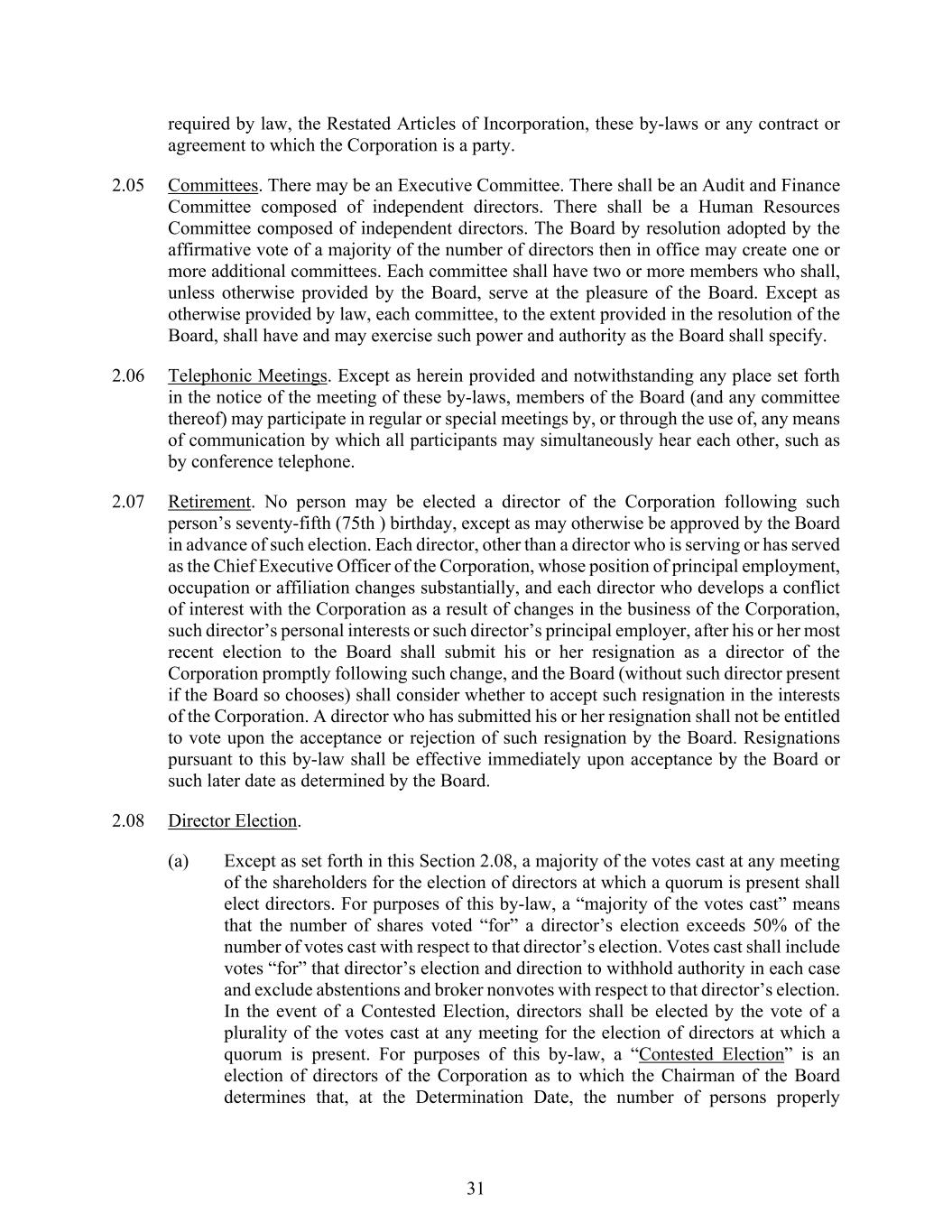 31 required by law, the Restated Articles of Incorporation, these by-laws or any contract or agreement to which the Corporation is a party. 2.05 Committees. There may be an Executive Committee. There shall be an Audit and Finance Committee composed of independent directors. There shall be a Human Resources Committee composed of independent directors. The Board by resolution adopted by the affirmative vote of a majority of the number of directors then in office may create one or more additional committees. Each committee shall have two or more members who shall, unless otherwise provided by the Board, serve at the pleasure of the Board. Except as otherwise provided by law, each committee, to the extent provided in the resolution of the Board, shall have and may exercise such power and authority as the Board shall specify. 2.06 Telephonic Meetings. Except as herein provided and notwithstanding any place set forth in the notice of the meeting of these by-laws, members of the Board (and any committee thereof) may participate in regular or special meetings by, or through the use of, any means of communication by which all participants may simultaneously hear each other, such as by conference telephone. 2.07 Retirement. No person may be elected a director of the Corporation following such person’s seventy-fifth (75th ) birthday, except as may otherwise be approved by the Board in advance of such election. Each director, other than a director who is serving or has served as the Chief Executive Officer of the Corporation, whose position of principal employment, occupation or affiliation changes substantially, and each director who develops a conflict of interest with the Corporation as a result of changes in the business of the Corporation, such director’s personal interests or such director’s principal employer, after his or her most recent election to the Board shall submit his or her resignation as a director of the Corporation promptly following such change, and the Board (without such director present if the Board so chooses) shall consider whether to accept such resignation in the interests of the Corporation. A director who has submitted his or her resignation shall not be entitled to vote upon the acceptance or rejection of such resignation by the Board. Resignations pursuant to this by-law shall be effective immediately upon acceptance by the Board or such later date as determined by the Board. 2.08 Director Election. (a) Except as set forth in this Section 2.08, a majority of the votes cast at any meeting of the shareholders for the election of directors at which a quorum is present shall elect directors. For purposes of this by-law, a “majority of the votes cast” means that the number of shares voted “for” a director’s election exceeds 50% of the number of votes cast with respect to that director’s election. Votes cast shall include votes “for” that director’s election and direction to withhold authority in each case and exclude abstentions and broker nonvotes with respect to that director’s election. In the event of a Contested Election, directors shall be elected by the vote of a plurality of the votes cast at any meeting for the election of directors at which a quorum is present. For purposes of this by-law, a “Contested Election” is an election of directors of the Corporation as to which the Chairman of the Board determines that, at the Determination Date, the number of persons properly
