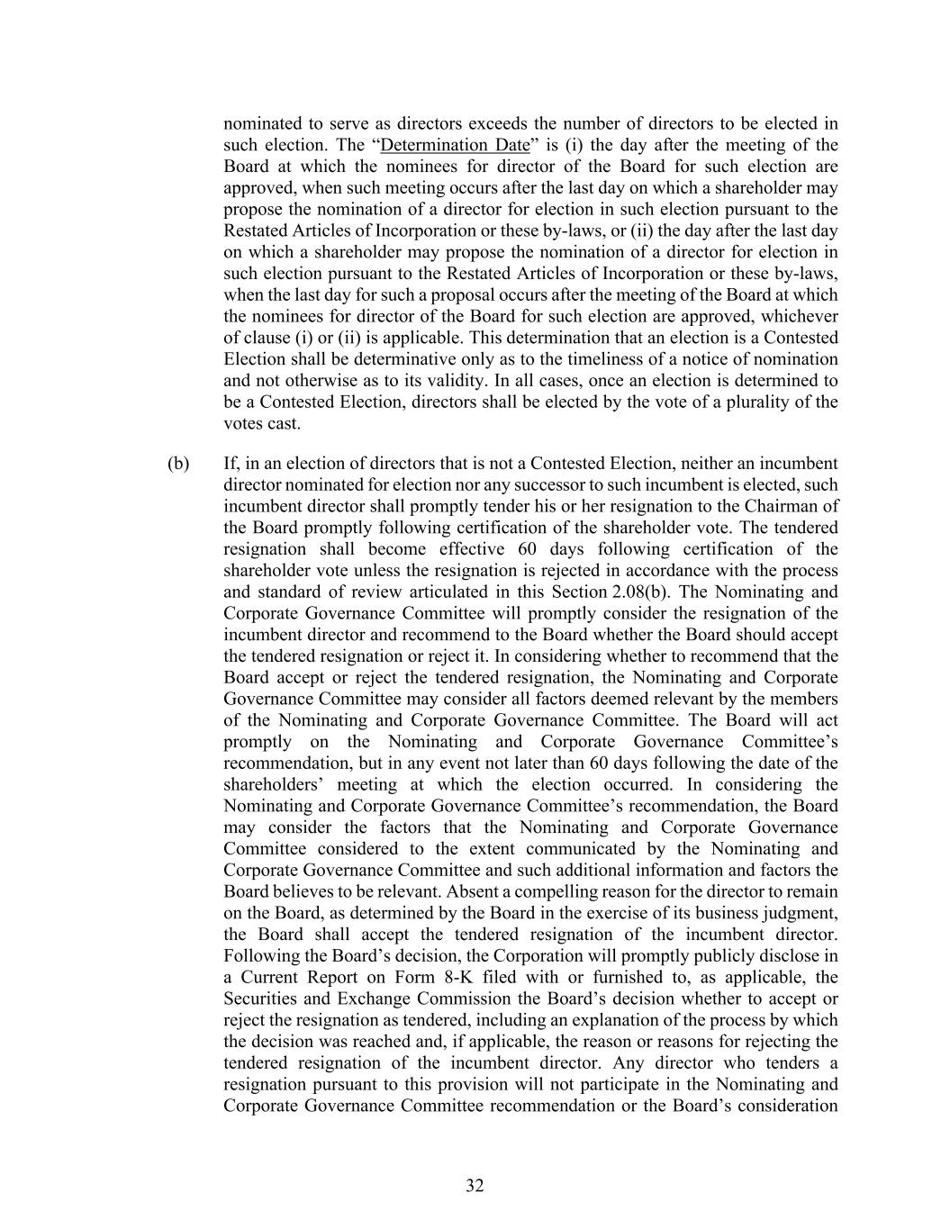 32 nominated to serve as directors exceeds the number of directors to be elected in such election. The “Determination Date” is (i) the day after the meeting of the Board at which the nominees for director of the Board for such election are approved, when such meeting occurs after the last day on which a shareholder may propose the nomination of a director for election in such election pursuant to the Restated Articles of Incorporation or these by-laws, or (ii) the day after the last day on which a shareholder may propose the nomination of a director for election in such election pursuant to the Restated Articles of Incorporation or these by-laws, when the last day for such a proposal occurs after the meeting of the Board at which the nominees for director of the Board for such election are approved, whichever of clause (i) or (ii) is applicable. This determination that an election is a Contested Election shall be determinative only as to the timeliness of a notice of nomination and not otherwise as to its validity. In all cases, once an election is determined to be a Contested Election, directors shall be elected by the vote of a plurality of the votes cast. (b) If, in an election of directors that is not a Contested Election, neither an incumbent director nominated for election nor any successor to such incumbent is elected, such incumbent director shall promptly tender his or her resignation to the Chairman of the Board promptly following certification of the shareholder vote. The tendered resignation shall become effective 60 days following certification of the shareholder vote unless the resignation is rejected in accordance with the process and standard of review articulated in this Section 2.08(b). The Nominating and Corporate Governance Committee will promptly consider the resignation of the incumbent director and recommend to the Board whether the Board should accept the tendered resignation or reject it. In considering whether to recommend that the Board accept or reject the tendered resignation, the Nominating and Corporate Governance Committee may consider all factors deemed relevant by the members of the Nominating and Corporate Governance Committee. The Board will act promptly on the Nominating and Corporate Governance Committee’s recommendation, but in any event not later than 60 days following the date of the shareholders’ meeting at which the election occurred. In considering the Nominating and Corporate Governance Committee’s recommendation, the Board may consider the factors that the Nominating and Corporate Governance Committee considered to the extent communicated by the Nominating and Corporate Governance Committee and such additional information and factors the Board believes to be relevant. Absent a compelling reason for the director to remain on the Board, as determined by the Board in the exercise of its business judgment, the Board shall accept the tendered resignation of the incumbent director. Following the Board’s decision, the Corporation will promptly publicly disclose in a Current Report on Form 8-K filed with or furnished to, as applicable, the Securities and Exchange Commission the Board’s decision whether to accept or reject the resignation as tendered, including an explanation of the process by which the decision was reached and, if applicable, the reason or reasons for rejecting the tendered resignation of the incumbent director. Any director who tenders a resignation pursuant to this provision will not participate in the Nominating and Corporate Governance Committee recommendation or the Board’s consideration