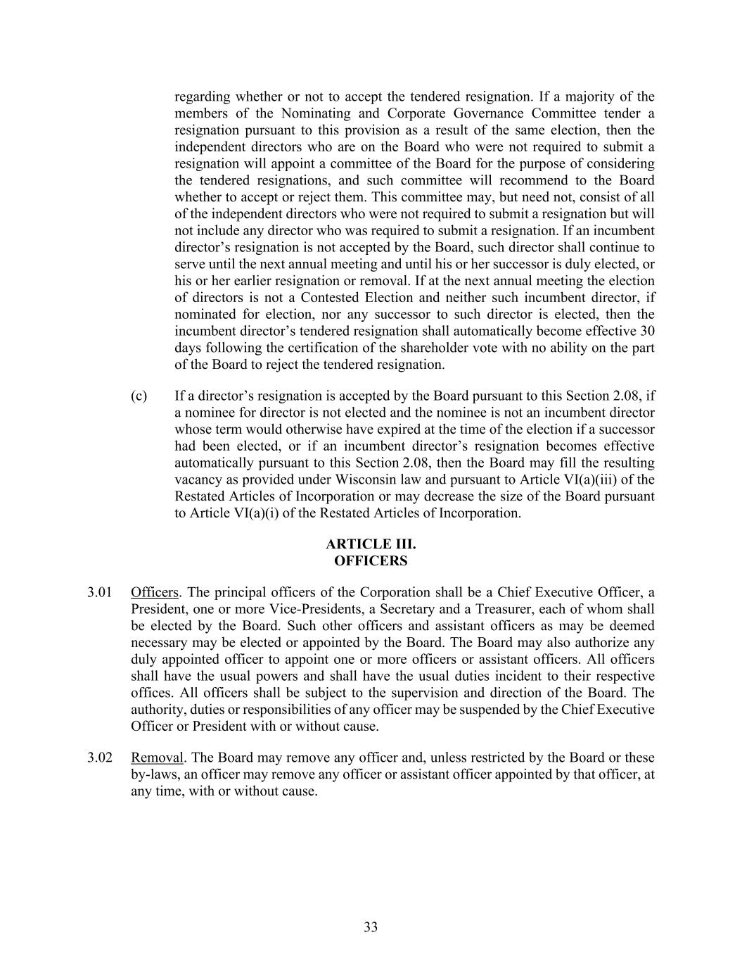 33 regarding whether or not to accept the tendered resignation. If a majority of the members of the Nominating and Corporate Governance Committee tender a resignation pursuant to this provision as a result of the same election, then the independent directors who are on the Board who were not required to submit a resignation will appoint a committee of the Board for the purpose of considering the tendered resignations, and such committee will recommend to the Board whether to accept or reject them. This committee may, but need not, consist of all of the independent directors who were not required to submit a resignation but will not include any director who was required to submit a resignation. If an incumbent director’s resignation is not accepted by the Board, such director shall continue to serve until the next annual meeting and until his or her successor is duly elected, or his or her earlier resignation or removal. If at the next annual meeting the election of directors is not a Contested Election and neither such incumbent director, if nominated for election, nor any successor to such director is elected, then the incumbent director’s tendered resignation shall automatically become effective 30 days following the certification of the shareholder vote with no ability on the part of the Board to reject the tendered resignation. (c) If a director’s resignation is accepted by the Board pursuant to this Section 2.08, if a nominee for director is not elected and the nominee is not an incumbent director whose term would otherwise have expired at the time of the election if a successor had been elected, or if an incumbent director’s resignation becomes effective automatically pursuant to this Section 2.08, then the Board may fill the resulting vacancy as provided under Wisconsin law and pursuant to Article VI(a)(iii) of the Restated Articles of Incorporation or may decrease the size of the Board pursuant to Article VI(a)(i) of the Restated Articles of Incorporation. ARTICLE III. OFFICERS 3.01 Officers. The principal officers of the Corporation shall be a Chief Executive Officer, a President, one or more Vice-Presidents, a Secretary and a Treasurer, each of whom shall be elected by the Board. Such other officers and assistant officers as may be deemed necessary may be elected or appointed by the Board. The Board may also authorize any duly appointed officer to appoint one or more officers or assistant officers. All officers shall have the usual powers and shall have the usual duties incident to their respective offices. All officers shall be subject to the supervision and direction of the Board. The authority, duties or responsibilities of any officer may be suspended by the Chief Executive Officer or President with or without cause. 3.02 Removal. The Board may remove any officer and, unless restricted by the Board or these by-laws, an officer may remove any officer or assistant officer appointed by that officer, at any time, with or without cause.