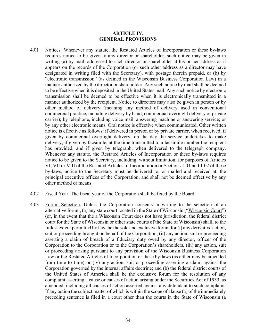 34 ARTICLE IV. GENERAL PROVISIONS 4.01 Notices. Whenever any statute, the Restated Articles of Incorporation or these by-laws requires notice to be given to any director or shareholder, such notice may be given in writing (a) by mail, addressed to such director or shareholder at his or her address as it appears on the records of the Corporation (or such other address as a director may have designated in writing filed with the Secretary), with postage therein prepaid, or (b) by “electronic transmission” (as defined in the Wisconsin Business Corporation Law) in a manner authorized by the director or shareholder. Any such notice by mail shall be deemed to be effective when it is deposited in the United States mail. Any such notice by electronic transmission shall be deemed to be effective when it is electronically transmitted in a manner authorized by the recipient. Notice to directors may also be given in person or by other method of delivery (meaning any method of delivery used in conventional commercial practice, including delivery by hand, commercial overnight delivery or private carrier); by telephone, including voice mail, answering machine or answering service; or by any other electronic means. Oral notice is effective when communicated. Other written notice is effective as follows: if delivered in person or by private carrier, when received; if given by commercial overnight delivery, on the day the service undertakes to make delivery; if given by facsimile, at the time transmitted to a facsimile number the recipient has provided; and if given by telegraph, when delivered to the telegraph company. Whenever any statute, the Restated Articles of Incorporation or these by-laws requires notice to be given to the Secretary, including, without limitation, for purposes of Articles VI, VII or VIII of the Restated Articles of Incorporation or Sections 1.01 and 1.02 of these by-laws, notice to the Secretary must be delivered to, or mailed and received at, the principal executive offices of the Corporation, and shall not be deemed effective by any other method or means. 4.02 Fiscal Year. The fiscal year of the Corporation shall be fixed by the Board. 4.03 Forum Selection. Unless the Corporation consents in writing to the selection of an alternative forum, (a) any state court located in the State of Wisconsin (“Wisconsin Court”) (or, in the event that the a Wisconsin Court does not have jurisdiction, the federal district court for the State of Wisconsin or other state courts of the State of Wisconsin) shall, to the fullest extent permitted by law, be the sole and exclusive forum for (i) any derivative action, suit or proceeding brought on behalf of the Corporation, (ii) any action, suit or proceeding asserting a claim of breach of a fiduciary duty owed by any director, officer of the Corporation to the Corporation or to the Corporation’s shareholders, (iii) any action, suit or proceeding arising pursuant to any provision of the Wisconsin Business Corporation Law or the Restated Articles of Incorporation or these by-laws (as either may be amended from time to time) or (iv) any action, suit or proceeding asserting a claim against the Corporation governed by the internal affairs doctrine; and (b) the federal district courts of the United States of America shall be the exclusive forum for the resolution of any complaint asserting a cause or causes of action arising under the Securities Act of 1933, as amended, including all causes of action asserted against any defendant to such complaint. If any action the subject matter of which is within the scope of clause (a) of the immediately preceding sentence is filed in a court other than the courts in the State of Wisconsin (a