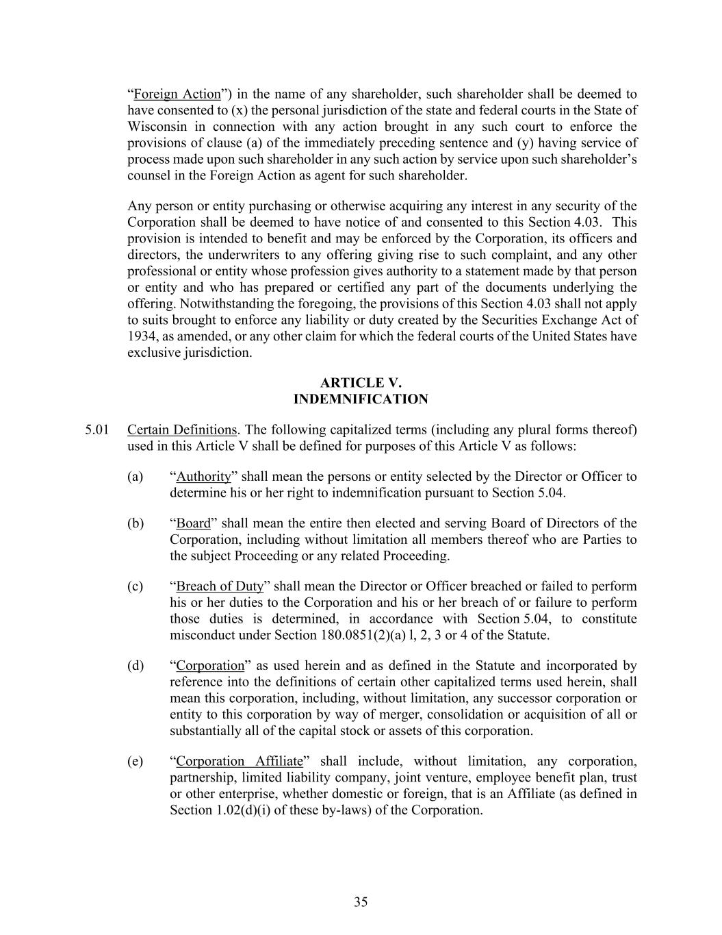 35 “Foreign Action”) in the name of any shareholder, such shareholder shall be deemed to have consented to (x) the personal jurisdiction of the state and federal courts in the State of Wisconsin in connection with any action brought in any such court to enforce the provisions of clause (a) of the immediately preceding sentence and (y) having service of process made upon such shareholder in any such action by service upon such shareholder’s counsel in the Foreign Action as agent for such shareholder. Any person or entity purchasing or otherwise acquiring any interest in any security of the Corporation shall be deemed to have notice of and consented to this Section 4.03. This provision is intended to benefit and may be enforced by the Corporation, its officers and directors, the underwriters to any offering giving rise to such complaint, and any other professional or entity whose profession gives authority to a statement made by that person or entity and who has prepared or certified any part of the documents underlying the offering. Notwithstanding the foregoing, the provisions of this Section 4.03 shall not apply to suits brought to enforce any liability or duty created by the Securities Exchange Act of 1934, as amended, or any other claim for which the federal courts of the United States have exclusive jurisdiction. ARTICLE V. INDEMNIFICATION 5.01 Certain Definitions. The following capitalized terms (including any plural forms thereof) used in this Article V shall be defined for purposes of this Article V as follows: (a) “Authority” shall mean the persons or entity selected by the Director or Officer to determine his or her right to indemnification pursuant to Section 5.04. (b) “Board” shall mean the entire then elected and serving Board of Directors of the Corporation, including without limitation all members thereof who are Parties to the subject Proceeding or any related Proceeding. (c) “Breach of Duty” shall mean the Director or Officer breached or failed to perform his or her duties to the Corporation and his or her breach of or failure to perform those duties is determined, in accordance with Section 5.04, to constitute misconduct under Section 180.0851(2)(a) l, 2, 3 or 4 of the Statute. (d) “Corporation” as used herein and as defined in the Statute and incorporated by reference into the definitions of certain other capitalized terms used herein, shall mean this corporation, including, without limitation, any successor corporation or entity to this corporation by way of merger, consolidation or acquisition of all or substantially all of the capital stock or assets of this corporation. (e) “Corporation Affiliate” shall include, without limitation, any corporation, partnership, limited liability company, joint venture, employee benefit plan, trust or other enterprise, whether domestic or foreign, that is an Affiliate (as defined in Section 1.02(d)(i) of these by-laws) of the Corporation.