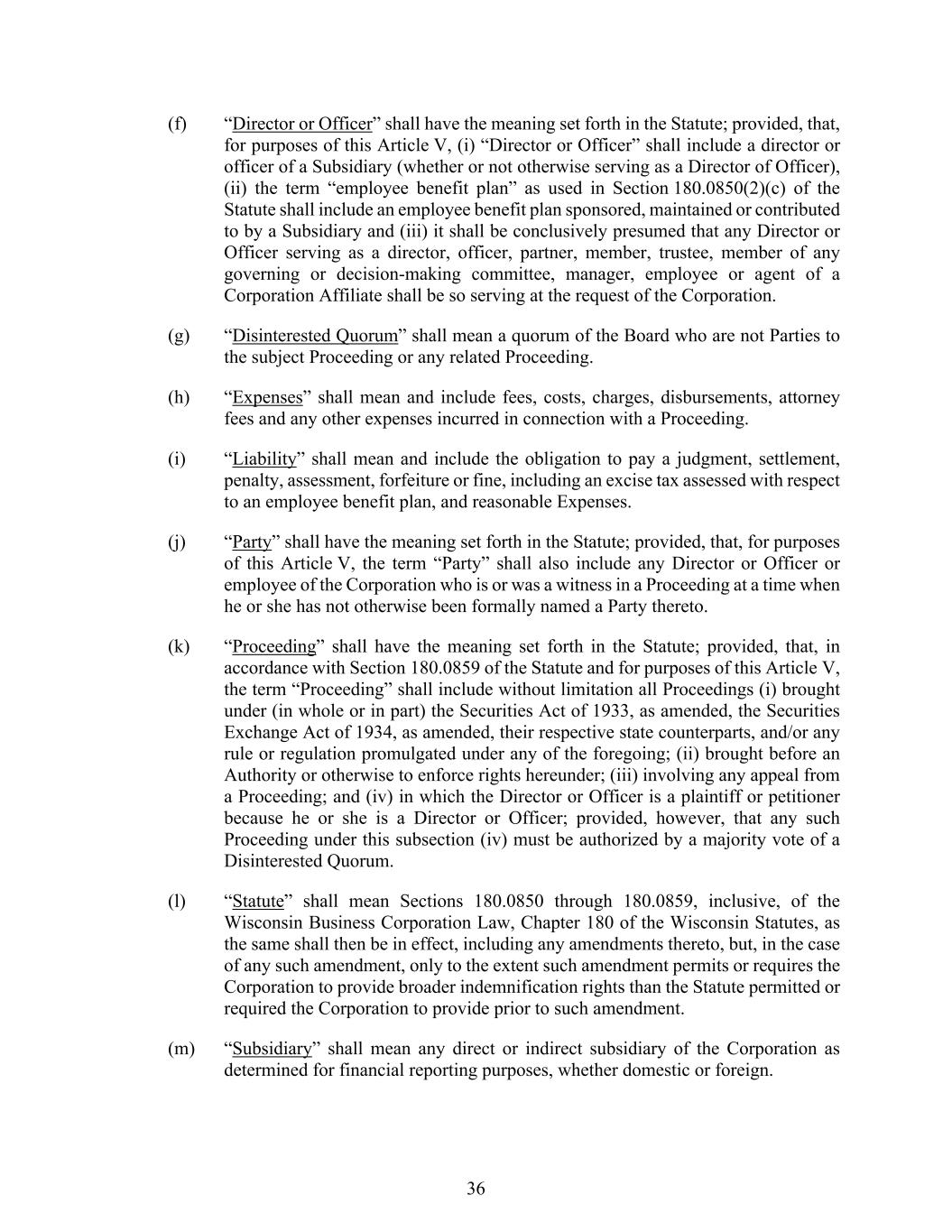 36 (f) “Director or Officer” shall have the meaning set forth in the Statute; provided, that, for purposes of this Article V, (i) “Director or Officer” shall include a director or officer of a Subsidiary (whether or not otherwise serving as a Director of Officer), (ii) the term “employee benefit plan” as used in Section 180.0850(2)(c) of the Statute shall include an employee benefit plan sponsored, maintained or contributed to by a Subsidiary and (iii) it shall be conclusively presumed that any Director or Officer serving as a director, officer, partner, member, trustee, member of any governing or decision-making committee, manager, employee or agent of a Corporation Affiliate shall be so serving at the request of the Corporation. (g) “Disinterested Quorum” shall mean a quorum of the Board who are not Parties to the subject Proceeding or any related Proceeding. (h) “Expenses” shall mean and include fees, costs, charges, disbursements, attorney fees and any other expenses incurred in connection with a Proceeding. (i) “Liability” shall mean and include the obligation to pay a judgment, settlement, penalty, assessment, forfeiture or fine, including an excise tax assessed with respect to an employee benefit plan, and reasonable Expenses. (j) “Party” shall have the meaning set forth in the Statute; provided, that, for purposes of this Article V, the term “Party” shall also include any Director or Officer or employee of the Corporation who is or was a witness in a Proceeding at a time when he or she has not otherwise been formally named a Party thereto. (k) “Proceeding” shall have the meaning set forth in the Statute; provided, that, in accordance with Section 180.0859 of the Statute and for purposes of this Article V, the term “Proceeding” shall include without limitation all Proceedings (i) brought under (in whole or in part) the Securities Act of 1933, as amended, the Securities Exchange Act of 1934, as amended, their respective state counterparts, and/or any rule or regulation promulgated under any of the foregoing; (ii) brought before an Authority or otherwise to enforce rights hereunder; (iii) involving any appeal from a Proceeding; and (iv) in which the Director or Officer is a plaintiff or petitioner because he or she is a Director or Officer; provided, however, that any such Proceeding under this subsection (iv) must be authorized by a majority vote of a Disinterested Quorum. (l) “Statute” shall mean Sections 180.0850 through 180.0859, inclusive, of the Wisconsin Business Corporation Law, Chapter 180 of the Wisconsin Statutes, as the same shall then be in effect, including any amendments thereto, but, in the case of any such amendment, only to the extent such amendment permits or requires the Corporation to provide broader indemnification rights than the Statute permitted or required the Corporation to provide prior to such amendment. (m) “Subsidiary” shall mean any direct or indirect subsidiary of the Corporation as determined for financial reporting purposes, whether domestic or foreign.