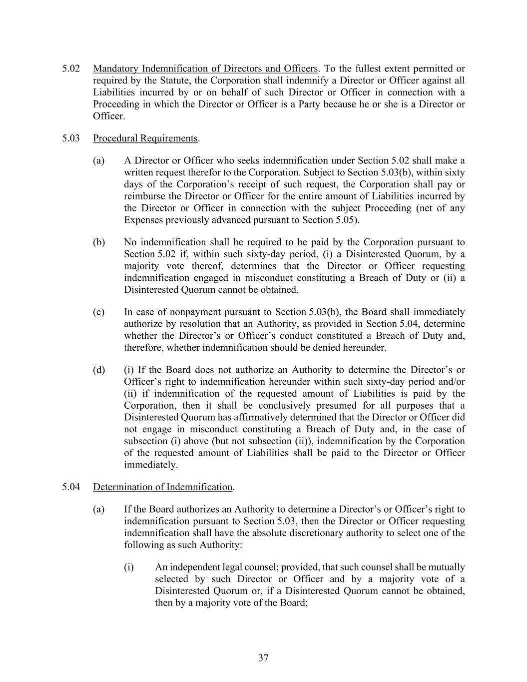 37 5.02 Mandatory Indemnification of Directors and Officers. To the fullest extent permitted or required by the Statute, the Corporation shall indemnify a Director or Officer against all Liabilities incurred by or on behalf of such Director or Officer in connection with a Proceeding in which the Director or Officer is a Party because he or she is a Director or Officer. 5.03 Procedural Requirements. (a) A Director or Officer who seeks indemnification under Section 5.02 shall make a written request therefor to the Corporation. Subject to Section 5.03(b), within sixty days of the Corporation’s receipt of such request, the Corporation shall pay or reimburse the Director or Officer for the entire amount of Liabilities incurred by the Director or Officer in connection with the subject Proceeding (net of any Expenses previously advanced pursuant to Section 5.05). (b) No indemnification shall be required to be paid by the Corporation pursuant to Section 5.02 if, within such sixty-day period, (i) a Disinterested Quorum, by a majority vote thereof, determines that the Director or Officer requesting indemnification engaged in misconduct constituting a Breach of Duty or (ii) a Disinterested Quorum cannot be obtained. (c) In case of nonpayment pursuant to Section 5.03(b), the Board shall immediately authorize by resolution that an Authority, as provided in Section 5.04, determine whether the Director’s or Officer’s conduct constituted a Breach of Duty and, therefore, whether indemnification should be denied hereunder. (d) (i) If the Board does not authorize an Authority to determine the Director’s or Officer’s right to indemnification hereunder within such sixty-day period and/or (ii) if indemnification of the requested amount of Liabilities is paid by the Corporation, then it shall be conclusively presumed for all purposes that a Disinterested Quorum has affirmatively determined that the Director or Officer did not engage in misconduct constituting a Breach of Duty and, in the case of subsection (i) above (but not subsection (ii)), indemnification by the Corporation of the requested amount of Liabilities shall be paid to the Director or Officer immediately. 5.04 Determination of Indemnification. (a) If the Board authorizes an Authority to determine a Director’s or Officer’s right to indemnification pursuant to Section 5.03, then the Director or Officer requesting indemnification shall have the absolute discretionary authority to select one of the following as such Authority: (i) An independent legal counsel; provided, that such counsel shall be mutually selected by such Director or Officer and by a majority vote of a Disinterested Quorum or, if a Disinterested Quorum cannot be obtained, then by a majority vote of the Board;
