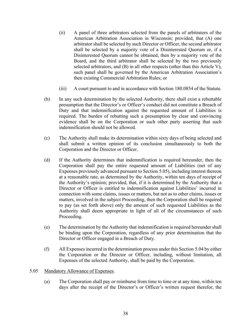 38 (ii) A panel of three arbitrators selected from the panels of arbitrators of the American Arbitration Association in Wisconsin; provided, that (A) one arbitrator shall be selected by such Director or Officer, the second arbitrator shall be selected by a majority vote of a Disinterested Quorum or, if a Disinterested Quorum cannot be obtained, then by a majority vote of the Board, and the third arbitrator shall be selected by the two previously selected arbitrators, and (B) in all other respects (other than this Article V), such panel shall be governed by the American Arbitration Association’s then existing Commercial Arbitration Rules; or (iii) A court pursuant to and in accordance with Section 180.0854 of the Statute. (b) In any such determination by the selected Authority, there shall exist a rebuttable presumption that the Director’s or Officer’s conduct did not constitute a Breach of Duty and that indemnification against the requested amount of Liabilities is required. The burden of rebutting such a presumption by clear and convincing evidence shall be on the Corporation or such other party asserting that such indemnification should not be allowed. (c) The Authority shall make its determination within sixty days of being selected and shall submit a written opinion of its conclusion simultaneously to both the Corporation and the Director or Officer. (d) If the Authority determines that indemnification is required hereunder, then the Corporation shall pay the entire requested amount of Liabilities (net of any Expenses previously advanced pursuant to Section 5.05), including interest thereon at a reasonable rate, as determined by the Authority, within ten days of receipt of the Authority’s opinion; provided, that, if it is determined by the Authority that a Director or Officer is entitled to indemnification against Liabilities’ incurred in connection with some claims, issues or matters, but not as to other claims, issues or matters, involved in the subject Proceeding, then the Corporation shall be required to pay (as set forth above) only the amount of such requested Liabilities as the Authority shall deem appropriate in light of all of the circumstances of such Proceeding. (e) The determination by the Authority that indemnification is required hereunder shall be binding upon the Corporation, regardless of any prior determination that the Director or Officer engaged in a Breach of Duty. (f) All Expenses incurred in the determination process under this Section 5.04 by either the Corporation or the Director or Officer, including, without limitation, all Expenses of the selected Authority, shall be paid by the Corporation. 5.05 Mandatory Allowance of Expenses. (a) The Corporation shall pay or reimburse from time to time or at any time, within ten days after the receipt of the Director’s or Officer’s written request therefor, the
