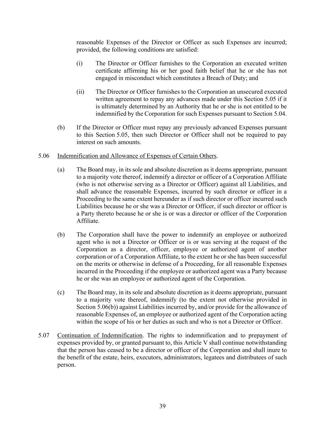 39 reasonable Expenses of the Director or Officer as such Expenses are incurred; provided, the following conditions are satisfied: (i) The Director or Officer furnishes to the Corporation an executed written certificate affirming his or her good faith belief that he or she has not engaged in misconduct which constitutes a Breach of Duty; and (ii) The Director or Officer furnishes to the Corporation an unsecured executed written agreement to repay any advances made under this Section 5.05 if it is ultimately determined by an Authority that he or she is not entitled to be indemnified by the Corporation for such Expenses pursuant to Section 5.04. (b) If the Director or Officer must repay any previously advanced Expenses pursuant to this Section 5.05, then such Director or Officer shall not be required to pay interest on such amounts. 5.06 Indemnification and Allowance of Expenses of Certain Others. (a) The Board may, in its sole and absolute discretion as it deems appropriate, pursuant to a majority vote thereof, indemnify a director or officer of a Corporation Affiliate (who is not otherwise serving as a Director or Officer) against all Liabilities, and shall advance the reasonable Expenses, incurred by such director or officer in a Proceeding to the same extent hereunder as if such director or officer incurred such Liabilities because he or she was a Director or Officer, if such director or officer is a Party thereto because he or she is or was a director or officer of the Corporation Affiliate. (b) The Corporation shall have the power to indemnify an employee or authorized agent who is not a Director or Officer or is or was serving at the request of the Corporation as a director, officer, employee or authorized agent of another corporation or of a Corporation Affiliate, to the extent he or she has been successful on the merits or otherwise in defense of a Proceeding, for all reasonable Expenses incurred in the Proceeding if the employee or authorized agent was a Party because he or she was an employee or authorized agent of the Corporation. (c) The Board may, in its sole and absolute discretion as it deems appropriate, pursuant to a majority vote thereof, indemnify (to the extent not otherwise provided in Section 5.06(b)) against Liabilities incurred by, and/or provide for the allowance of reasonable Expenses of, an employee or authorized agent of the Corporation acting within the scope of his or her duties as such and who is not a Director or Officer. 5.07 Continuation of Indemnification. The rights to indemnification and to prepayment of expenses provided by, or granted pursuant to, this Article V shall continue notwithstanding that the person has ceased to be a director or officer of the Corporation and shall inure to the benefit of the estate, heirs, executors, administrators, legatees and distributees of such person.