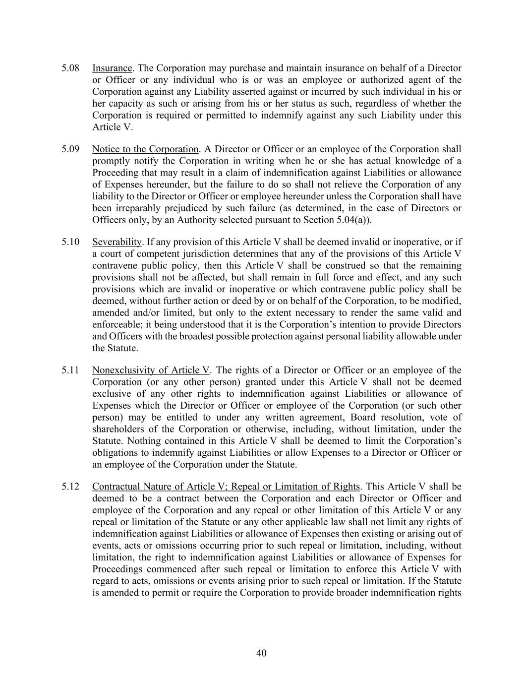 40 5.08 Insurance. The Corporation may purchase and maintain insurance on behalf of a Director or Officer or any individual who is or was an employee or authorized agent of the Corporation against any Liability asserted against or incurred by such individual in his or her capacity as such or arising from his or her status as such, regardless of whether the Corporation is required or permitted to indemnify against any such Liability under this Article V. 5.09 Notice to the Corporation. A Director or Officer or an employee of the Corporation shall promptly notify the Corporation in writing when he or she has actual knowledge of a Proceeding that may result in a claim of indemnification against Liabilities or allowance of Expenses hereunder, but the failure to do so shall not relieve the Corporation of any liability to the Director or Officer or employee hereunder unless the Corporation shall have been irreparably prejudiced by such failure (as determined, in the case of Directors or Officers only, by an Authority selected pursuant to Section 5.04(a)). 5.10 Severability. If any provision of this Article V shall be deemed invalid or inoperative, or if a court of competent jurisdiction determines that any of the provisions of this Article V contravene public policy, then this Article V shall be construed so that the remaining provisions shall not be affected, but shall remain in full force and effect, and any such provisions which are invalid or inoperative or which contravene public policy shall be deemed, without further action or deed by or on behalf of the Corporation, to be modified, amended and/or limited, but only to the extent necessary to render the same valid and enforceable; it being understood that it is the Corporation’s intention to provide Directors and Officers with the broadest possible protection against personal liability allowable under the Statute. 5.11 Nonexclusivity of Article V. The rights of a Director or Officer or an employee of the Corporation (or any other person) granted under this Article V shall not be deemed exclusive of any other rights to indemnification against Liabilities or allowance of Expenses which the Director or Officer or employee of the Corporation (or such other person) may be entitled to under any written agreement, Board resolution, vote of shareholders of the Corporation or otherwise, including, without limitation, under the Statute. Nothing contained in this Article V shall be deemed to limit the Corporation’s obligations to indemnify against Liabilities or allow Expenses to a Director or Officer or an employee of the Corporation under the Statute. 5.12 Contractual Nature of Article V; Repeal or Limitation of Rights. This Article V shall be deemed to be a contract between the Corporation and each Director or Officer and employee of the Corporation and any repeal or other limitation of this Article V or any repeal or limitation of the Statute or any other applicable law shall not limit any rights of indemnification against Liabilities or allowance of Expenses then existing or arising out of events, acts or omissions occurring prior to such repeal or limitation, including, without limitation, the right to indemnification against Liabilities or allowance of Expenses for Proceedings commenced after such repeal or limitation to enforce this Article V with regard to acts, omissions or events arising prior to such repeal or limitation. If the Statute is amended to permit or require the Corporation to provide broader indemnification rights