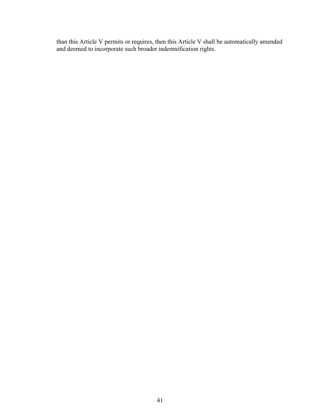 41 than this Article V permits or requires, then this Article V shall be automatically amended and deemed to incorporate such broader indemnification rights.
