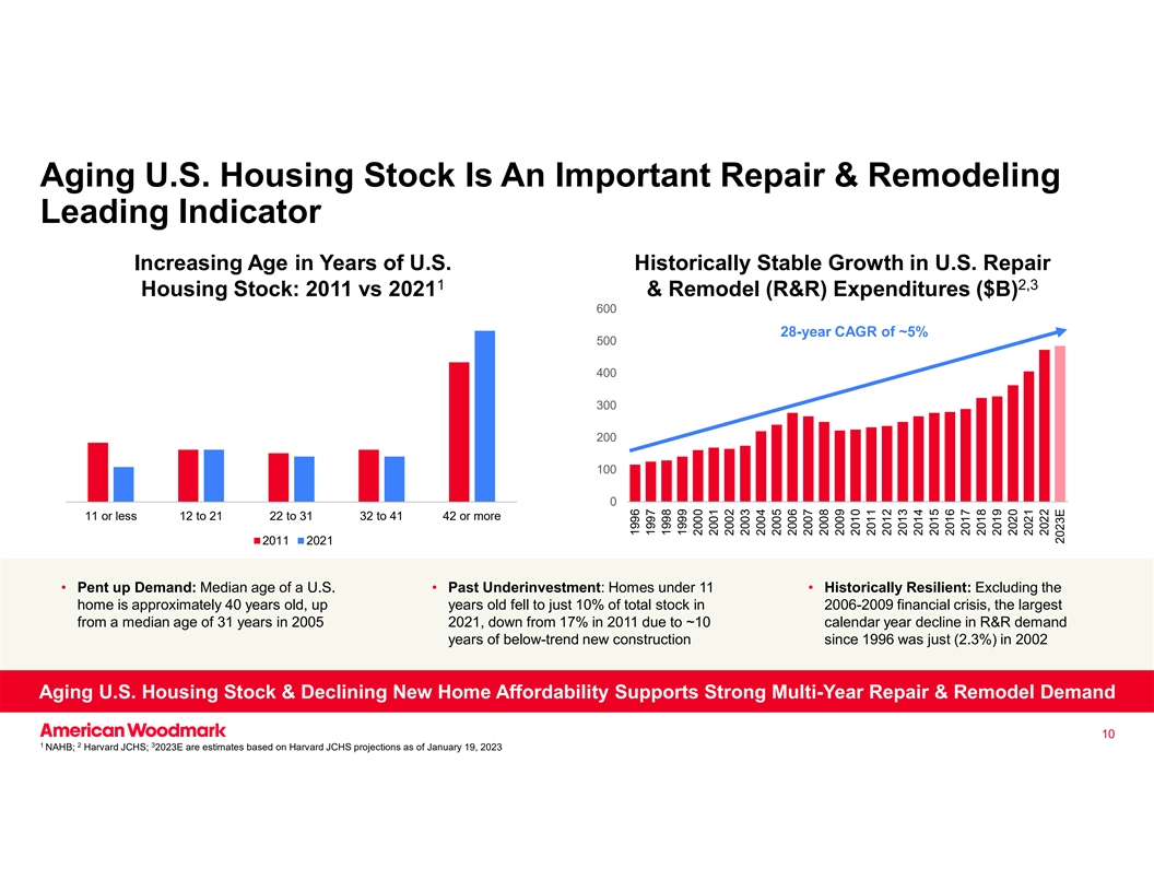 Aging U.S. Housing Stock Is An Important Repair & Remodeling Leading Indicator Increasing Age in Years of U.S. Historically Stable Growth in U.S. Repair 1 2,3 Housing Stock: 2011 vs 2021 & Remodel (R&R) Expenditures ($B) 600 28-year CAGR of ~5% 500 400 300 200 100 0 11 or less 12 to 21 22 to 31 32 to 41 42 or more 2011 2021 • Pent up Demand: Median age of a U.S. • Past Underinvestment: Homes under 11 • Historically Resilient: Excluding the home is approximately 40 years old, up years old fell to just 10% of total stock in 2006-2009 financial crisis, the largest from a median age of 31 years in 2005 2021, down from 17% in 2011 due to ~10 calendar year decline in R&R demand years of below-trend new construction since 1996 was just (2.3%) in 2002 Aging U.S. Housing Stock & Declining New Home Affordability Supports Strong Multi-Year Repair & Remodel Demand 10 1 2 3 NAHB; Harvard JCHS; 2023E are estimates based on Harvard JCHS projections as of January 19, 2023 1996 1997 1998 1999 2000 2001 2002 2003 2004 2005 2006 2007 2008 2009 2010 2011 2012 2013 2014 2015 2016 2017 2018 2019 2020 2021 2022 2023E