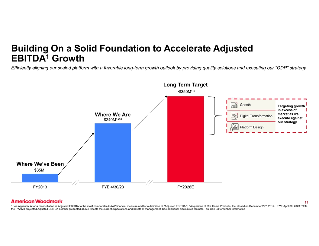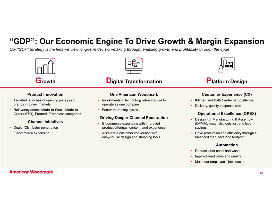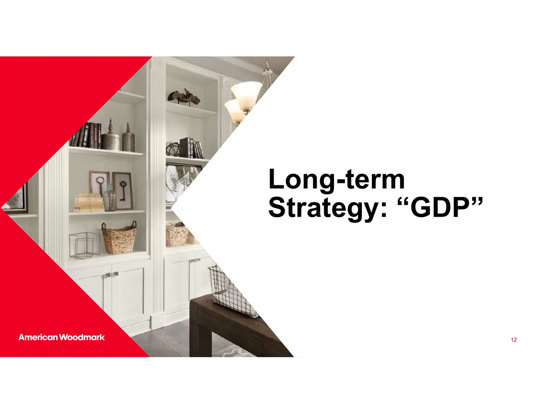 Building On a Solid Foundation to Accelerate Adjusted 1 EBITDA Growth Efficiently aligning our scaled platform with a favorable long-term growth outlook by providing quality solutions and executing our “GDP” strategy EBITDA Long Term Target 1,4 >$350M Growth Targeting growth in excess of market as we Where We Are Digital Transformation execute against 1,2,3 $240M our strategy Platform Design Where We’ve Been 1 $35M FY2013 FYE 4/30/23 FY2028E 11 1 2 th 3 4 See Appendix A for a reconciliation of Adjusted EBITDA to the most comparable GAAP financial measure and for a definition of “Adjusted EBITDA.”; Acquisition of RSI Home Products, Inc. closed on December 29 , 2017. FYE April 30, 2023 Note 1 the FY2028 projected Adjusted EBITDA number presented above reflects the current expectations and beliefs of management. See additional disclosures footnote on slide 33 for further information