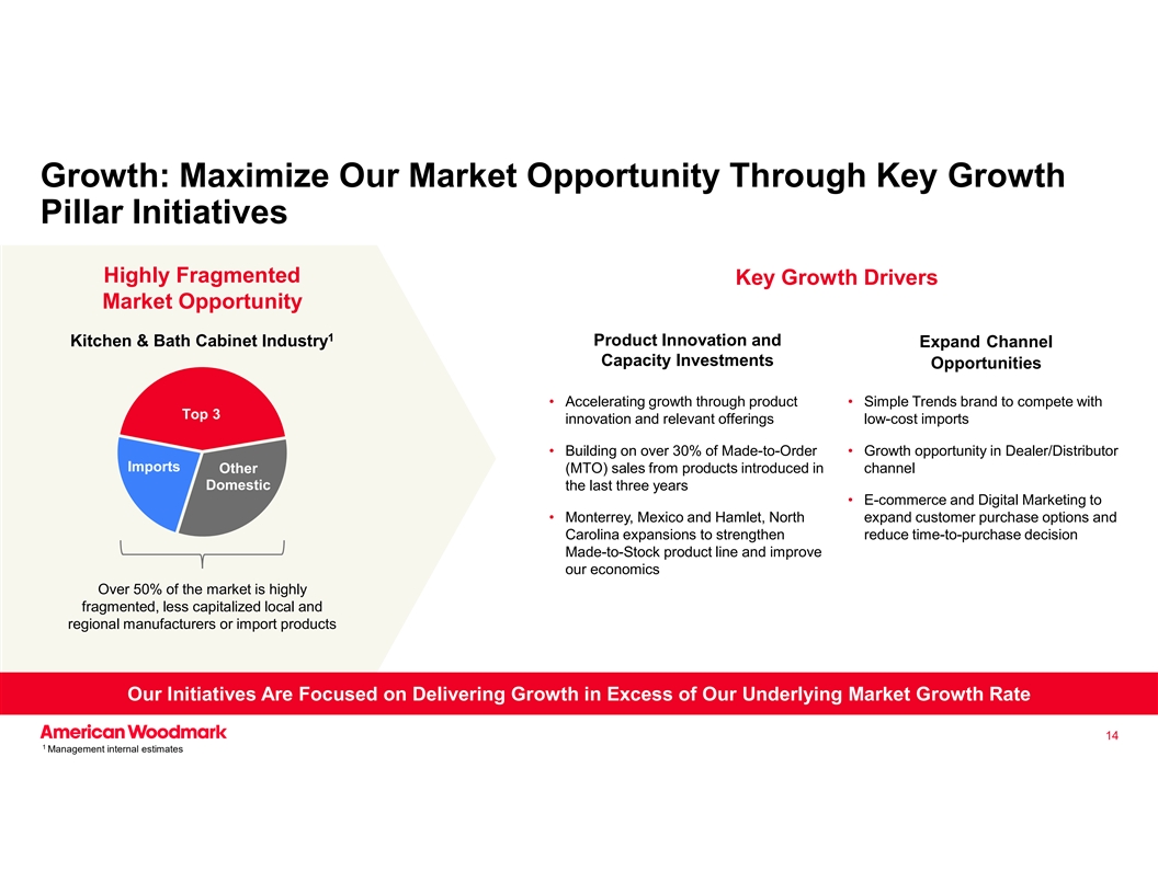 “GDP”: Our Economic Engine To Drive Growth & Margin Expansion Our “GDP” Strategy is the lens we view long-term decision-making through, enabling growth and profitability through the cycle Growth Digital Transformation Platform Design Product Innovation One American Woodmark Customer Experience (CX) • Targeted launches of opening price point • Investments in technology infrastructure to • Kitchen and Bath Center of Excellence brands into new markets operate as one company • Delivery, quality, response rate • Relevancy across Made-to-Stock, Made-to- • Faster marketing cycles Order (MTO), Framed, Frameless categories Operational Excellence (OPEX) Driving Deeper Channel Penetration • Design For Manufacturing & Assembly Channel Initiatives • E-commerce expanding with improved (DFMA), materials, logistics, and labor • Dealer/Distributor penetration product offerings, content, and experience savings • E-commerce expansion • Accelerate customer conversion with • Drive production and efficiency through a easy-to-use design and shopping tools balanced manufacturing footprint Automation • Reduce labor costs and waste • Improve lead times and quality • Make our employee’s jobs easier 13