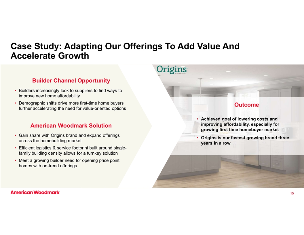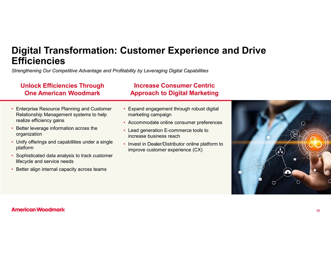 Case Study: Adapting Our Offerings To Add Value And Accelerate Growth Builder Channel Opportunity • Builders increasingly look to suppliers to find ways to improve new home affordability • Demographic shifts drive more first-time home buyers Outcome further accelerating the need for value-oriented options • Achieved goal of lowering costs and improving affordability, especially for American Woodmark Solution growing first time homebuyer market • Gain share with Origins brand and expand offerings • Origins is our fastest growing brand three across the homebuilding market years in a row • Efficient logistics & service footprint built around single- family building density allows for a turnkey solution • Meet a growing builder need for opening price point homes with on-trend offerings 15