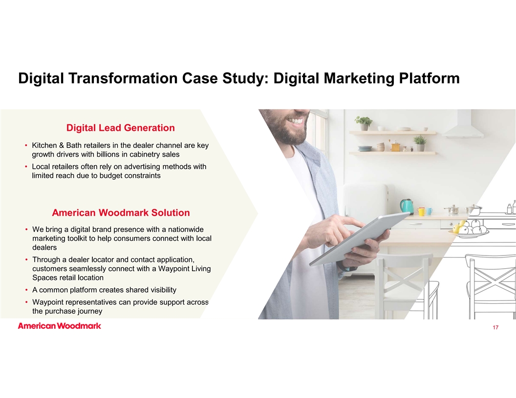 Digital Transformation: Customer Experience and Drive Efficiencies Strengthening Our Competitive Advantage and Profitability by Leveraging Digital Capabilities Unlock Efficiencies Through Increase Consumer Centric One American Woodmark Approach to Digital Marketing • Enterprise Resource Planning and Customer • Expand engagement through robust digital Relationship Management systems to help marketing campaign realize efficiency gains • Accommodate online consumer preferences • Better leverage information across the • Lead generation E-commerce tools to organization increase business reach • Unify offerings and capabilities under a single • Invest in Dealer/Distributor online platform to platform improve customer experience (CX) • Sophisticated data analysis to track customer lifecycle and service needs • Better align internal capacity across teams 16