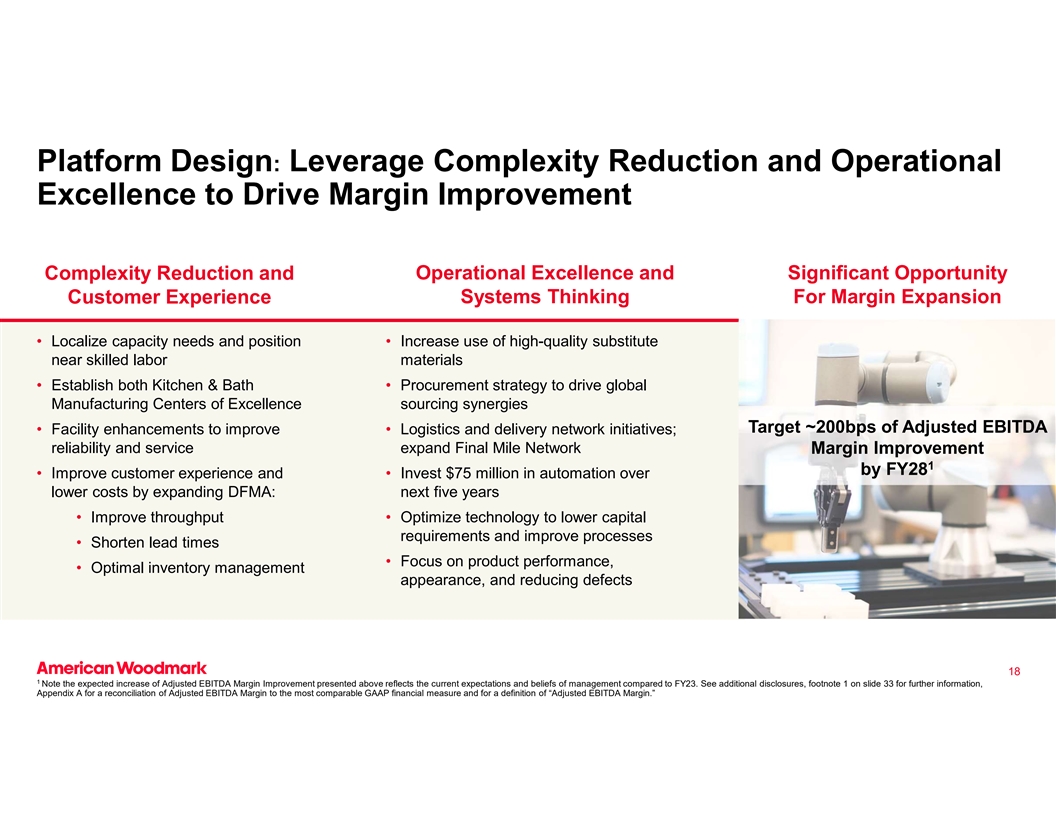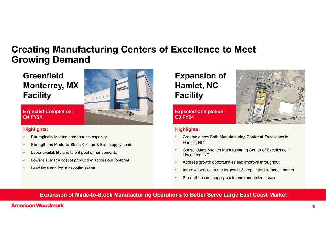 Platform Design: Leverage Complexity Reduction and Operational Excellence to Drive Margin Improvement Complexity Reduction and Operational Excellence and Significant Opportunity Customer Experience Systems Thinking For Margin Expansion • Localize capacity needs and position • Increase use of high-quality substitute near skilled labor materials • Establish both Kitchen & Bath • Procurement strategy to drive global Manufacturing Centers of Excellence sourcing synergies Target ~200bps of Adjusted EBITDA • Facility enhancements to improve • Logistics and delivery network initiatives; reliability and service expand Final Mile Network Margin Improvement 1 by FY28 • Improve customer experience and • Invest $75 million in automation over lower costs by expanding DFMA: next five years • Improve throughput • Optimize technology to lower capital requirements and improve processes • Shorten lead times • Focus on product performance, • Optimal inventory management appearance, and reducing defects 18 1 Note the expected increase of Adjusted EBITDA Margin Improvement presented above reflects the current expectations and beliefs of management compared to FY23. See additional disclosures, footnote 1 on slide 33 for further information, Appendix A for a reconciliation of Adjusted EBITDA Margin to the most comparable GAAP financial measure and for a definition of “Adjusted EBITDA Margin.”