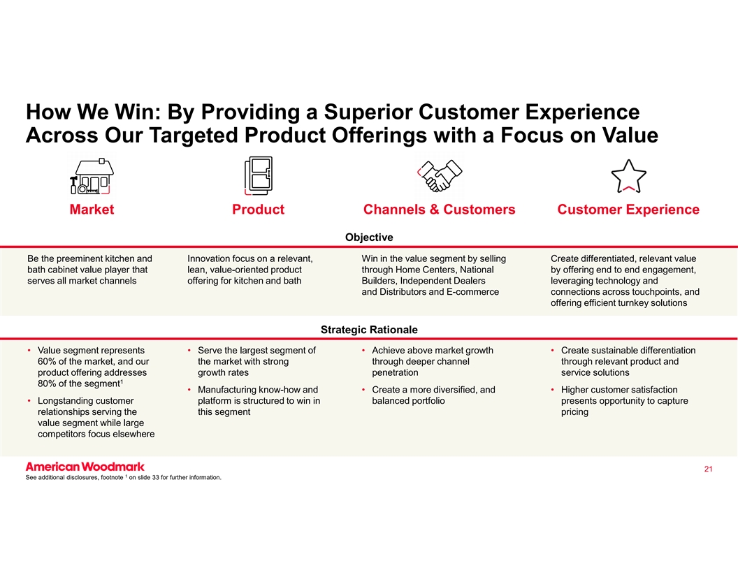 How We Win: By Providing a Superior Customer Experience Across Our Targeted Product Offerings with a Focus on Value Market Product Channels & Customers Customer Experience Objective Be the preeminent kitchen and Innovation focus on a relevant, Win in the value segment by selling Create differentiated, relevant value bath cabinet value player that lean, value-oriented product through Home Centers, National by offering end to end engagement, serves all market channels offering for kitchen and bath Builders, Independent Dealers leveraging technology and and Distributors and E-commerce connections across touchpoints, and offering efficient turnkey solutions Strategic Rationale • Value segment represents • Serve the largest segment of • Achieve above market growth • Create sustainable differentiation 60% of the market, and our the market with strong through deeper channel through relevant product and product offering addresses growth rates penetration service solutions 1 80% of the segment • Manufacturing know-how and • Create a more diversified, and • Higher customer satisfaction • Longstanding customer platform is structured to win in balanced portfolio presents opportunity to capture relationships serving the this segment pricing value segment while large competitors focus elsewhere 21 1 See additional disclosures, footnote on slide 33 for further information.