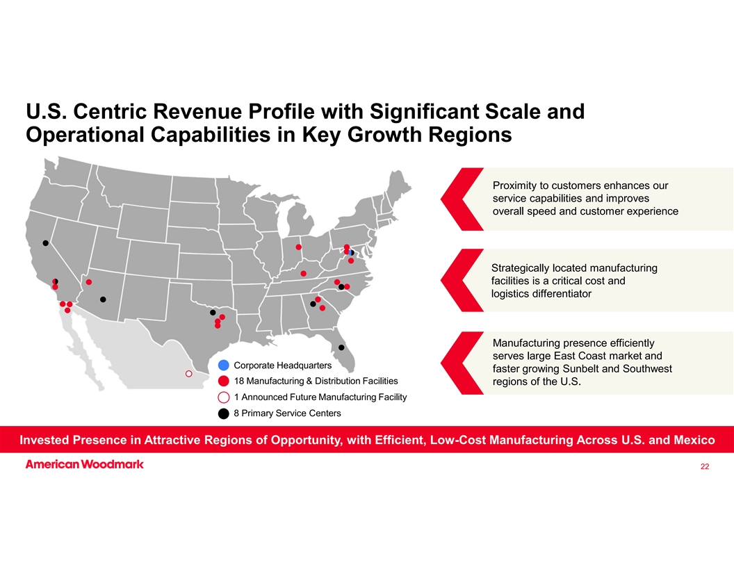 U.S. Centric Revenue Profile with Significant Scale and Operational Capabilities in Key Growth Regions Proximity to customers enhances our service capabilities and improves overall speed and customer experience Strategically located manufacturing facilities is a critical cost and logistics differentiator Manufacturing presence efficiently serves large East Coast market and Corporate Headquarters faster growing Sunbelt and Southwest 18 Manufacturing & Distribution Facilities regions of the U.S. 1 Announced Future Manufacturing Facility 8 Primary Service Centers Invested Presence in Attractive Regions of Opportunity, with Efficient, Low-Cost Manufacturing Across U.S. and Mexico 22