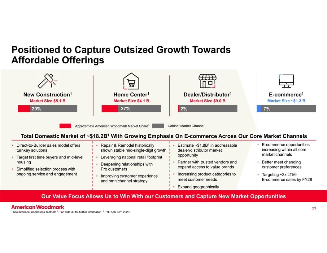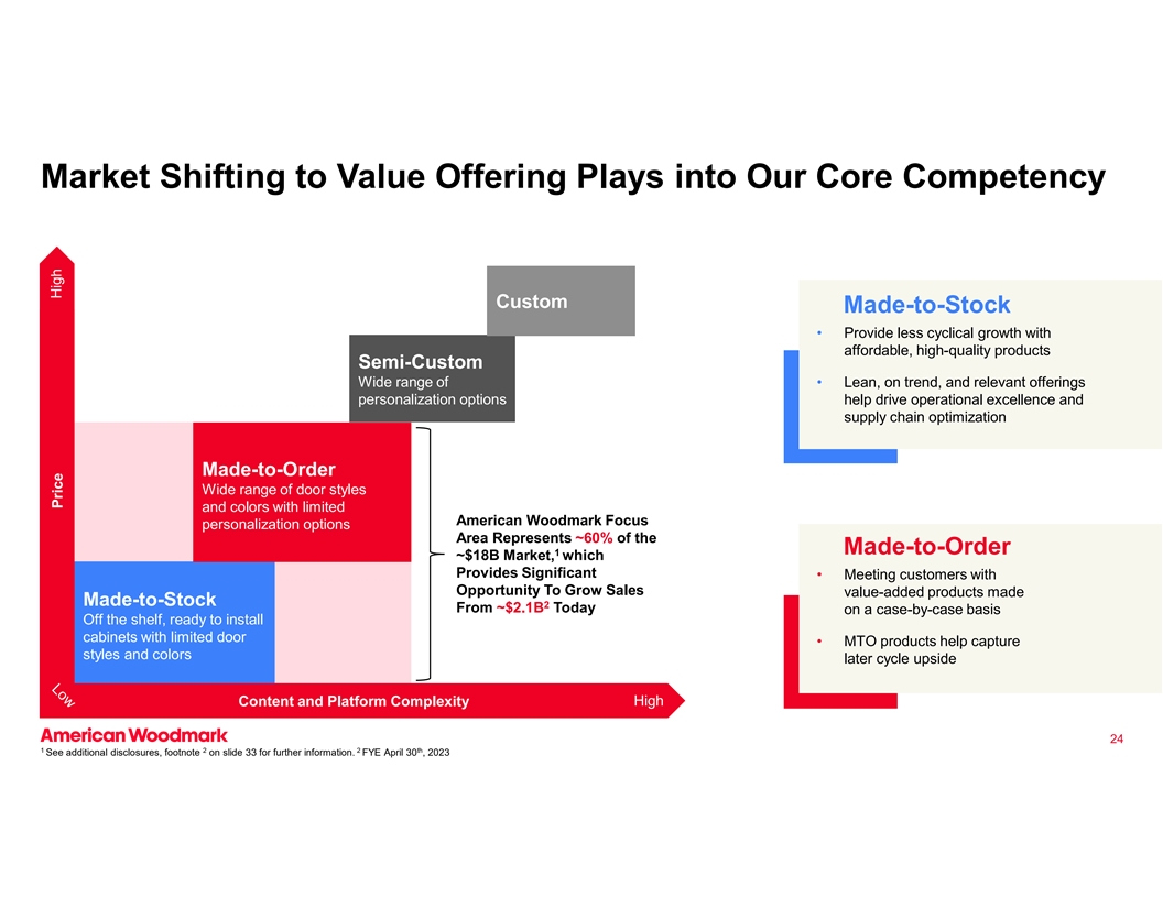Positioned to Capture Outsized Growth Towards Affordable Offerings 1 1 1 1 New Construction Home Center Dealer/Distributor E-commerce Market Size $5.1 B Market Size $4.1 B Market Size $9.0 B Market Size ~$1.3 B 20% 27% 2% 7% 2 Approximate American Woodmark Market Share Cabinet Market Channel 1 Total Domestic Market of ~$18.2B With Growing Emphasis On E-commerce Across Our Core Market Channels 1 • E-commerce opportunities • Direct-to-Builder sales model offers • Repair & Remodel historically • Estimate ~$1.8B in addressable increasing within all core turnkey solutions shown stable mid-single-digit growth dealer/distributor market market channels opportunity • Target first time buyers and mid-level • Leveraging national retail footprint housing • Partner with trusted vendors and • Better meet changing • Deepening relationships with expand access to value brands customer preferences • Simplified selection process with Pro customers 2 ongoing service and engagement • Increasing product categories to • Targeting ~3x LTM • Improving customer experience meet customer needs E-commerce sales by FY28 and omnichannel strategy • Expand geographically Our Value Focus Allows Us to Win With our Customers and Capture New Market Opportunities 23 1 2 3 2 th See additional disclosures, footnote , on slide 33 for further information. FYE April 30 , 2023.