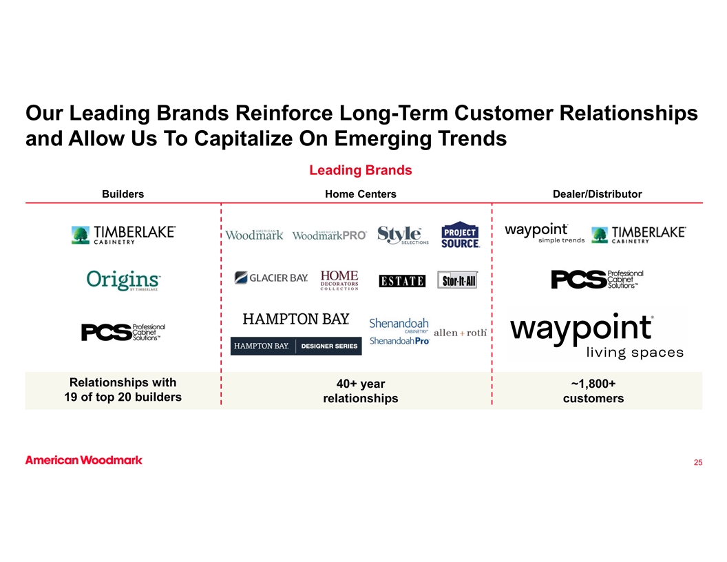 Our Leading Brands Reinforce Long-Term Customer Relationships and Allow Us To Capitalize On Emerging Trends Leading Brands Builders Home Centers Dealer/Distributor Relationships with 40+ year ~1,800+ 19 of top 20 builders relationships customers 25
