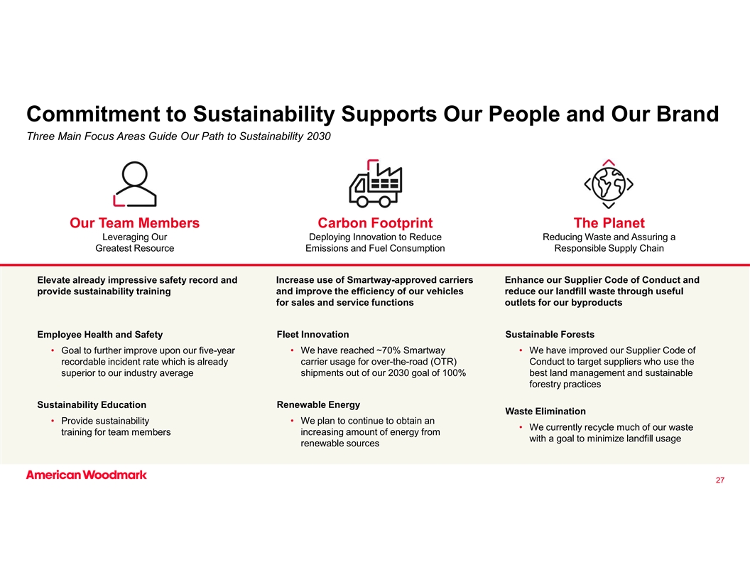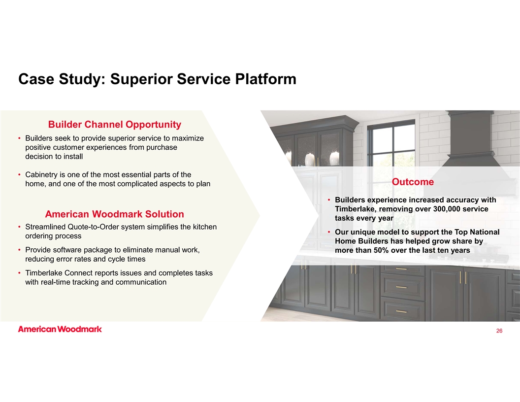 Case Study: Superior Service Platform Builder Channel Opportunity • Builders seek to provide superior service to maximize positive customer experiences from purchase decision to install • Cabinetry is one of the most essential parts of the Outcome home, and one of the most complicated aspects to plan • Builders experience increased accuracy with Timberlake, removing over 300,000 service American Woodmark Solution tasks every year • Streamlined Quote-to-Order system simplifies the kitchen • Our unique model to support the Top National ordering process Home Builders has helped grow share by • Provide software package to eliminate manual work, more than 50% over the last ten years reducing error rates and cycle times • Timberlake Connect reports issues and completes tasks with real-time tracking and communication 26