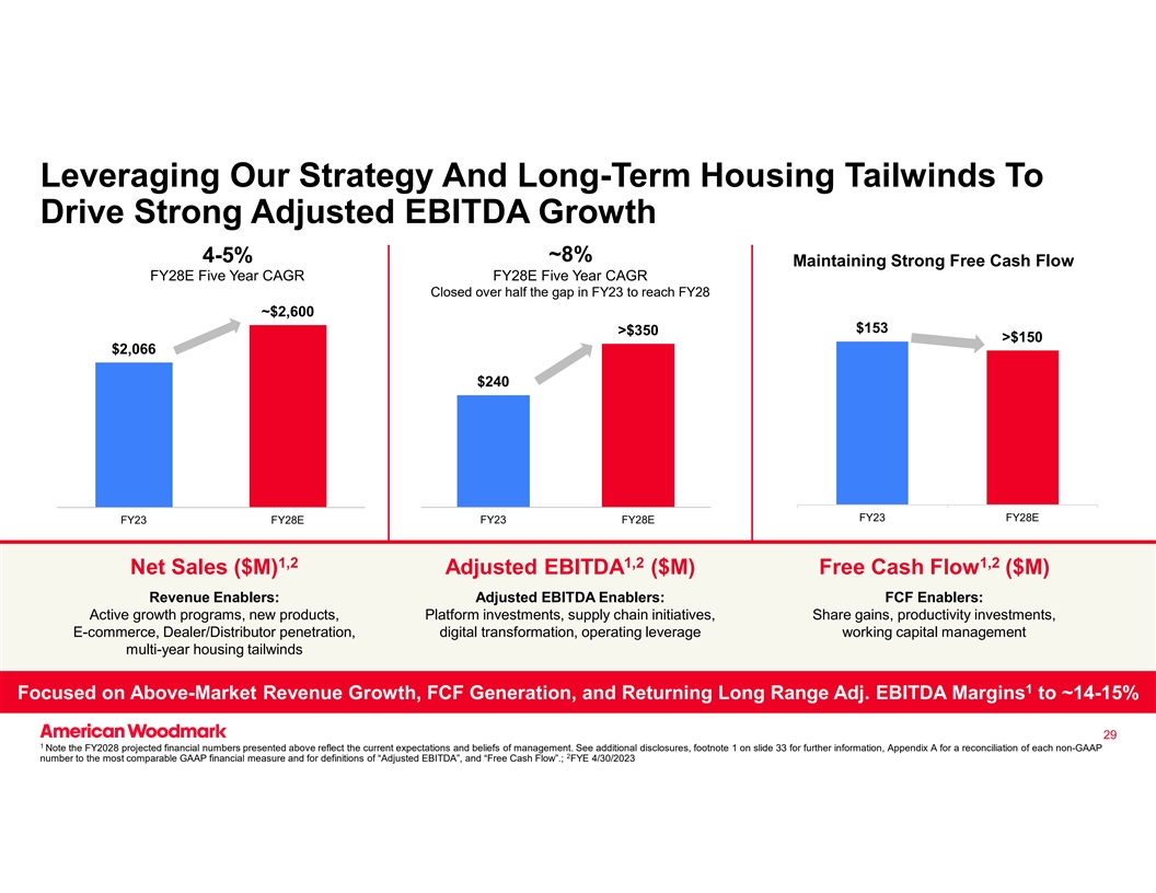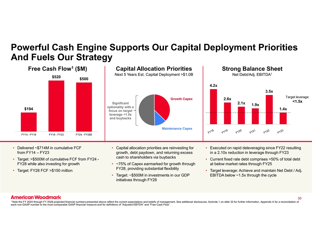 Leveraging Our Strategy And Long-Term Housing Tailwinds To Drive Strong Adjusted EBITDA Growth ~8% 4-5% Maintaining Strong Free Cash Flow FY28E Five Year CAGR FY28E Five Year CAGR Closed over half the gap in FY23 to reach FY28 ~$2,600 $153 >$350 >$150 $2,066 $240 FY23 FY28E FY23 FY28E FY23 FY28E 1,2 1,2 1,2 Net Sales ($M) Adjusted EBITDA ($M) Free Cash Flow ($M) Revenue Enablers: Adjusted EBITDA Enablers: FCF Enablers: Active growth programs, new products, Platform investments, supply chain initiatives, Share gains, productivity investments, E-commerce, Dealer/Distributor penetration, digital transformation, operating leverage working capital management multi-year housing tailwinds 1 Focused on Above-Market Revenue Growth, FCF Generation, and Returning Long Range Adj. EBITDA Margins to ~14-15% 29 1 Note the FY2028 projected financial numbers presented above reflect the current expectations and beliefs of management. See additional disclosures, footnote 1 on slide 33 for further information, Appendix A for a reconciliation of each non-GAAP 2 number to the most comparable GAAP financial measure and for definitions of “Adjusted EBITDA”, and “Free Cash Flow”.; FYE 4/30/2023