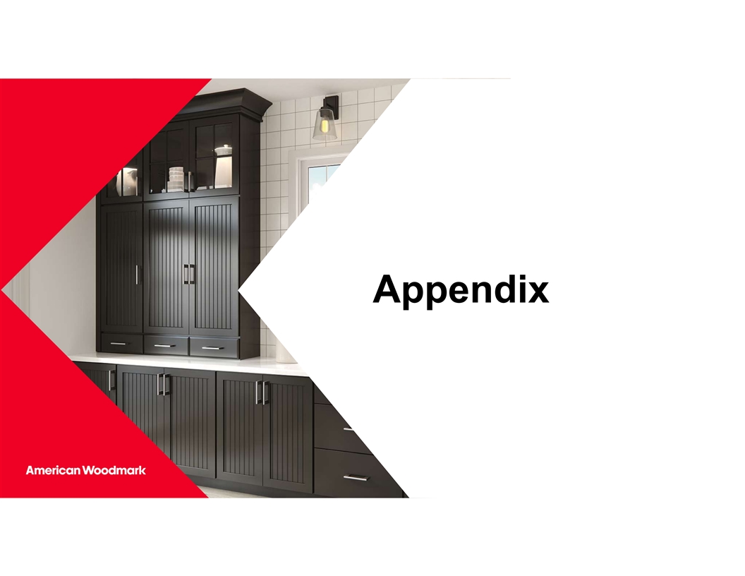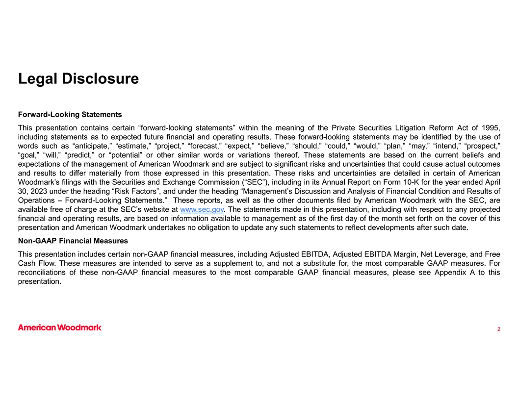 Legal Disclosure Forward-Looking Statements This presentation contains certain “forward-looking statements” within the meaning of the Private Securities Litigation Reform Act of 1995, including statements as to expected future financial and operating results. These forward-looking statements may be identified by the use of words such as “anticipate,” “estimate,” “project,” “forecast,” “expect,” “believe,” “should,” “could,” “would,” “plan,” “may,” “intend,” “prospect,” “goal,” “will,” “predict,” or “potential” or other similar words or variations thereof. These statements are based on the current beliefs and expectations of the management of American Woodmark and are subject to significant risks and uncertainties that could cause actual outcomes and results to differ materially from those expressed in this presentation. These risks and uncertainties are detailed in certain of American Woodmark’s filings with the Securities and Exchange Commission (“SEC”), including in its Annual Report on Form 10-K for the year ended April 30, 2023 under the heading “Risk Factors”, and under the heading “Management’s Discussion and Analysis of Financial Condition and Results of Operations – Forward-Looking Statements.” These reports, as well as the other documents filed by American Woodmark with the SEC, are available free of charge at the SEC’s website at www.sec.gov. The statements made in this presentation, including with respect to any projected financial and operating results, are based on information available to management as of the first day of the month set forth on the cover of this presentation and American Woodmark undertakes no obligation to update any such statements to reflect developments after such date. Non-GAAP Financial Measures This presentation includes certain non-GAAP financial measures, including Adjusted EBITDA, Adjusted EBITDA Margin, Net Leverage, and Free Cash Flow. These measures are intended to serve as a supplement to, and not a substitute for, the most comparable GAAP measures. For reconciliations of these non-GAAP financial measures to the most comparable GAAP financial measures, please see Appendix A to this presentation. 2