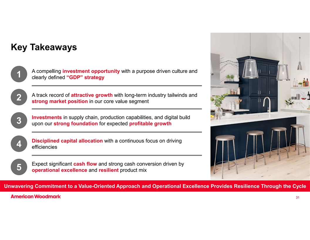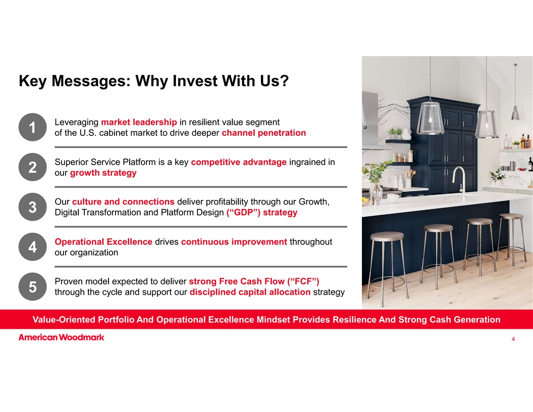 Key Messages: Why Invest With Us? Leveraging market leadership in resilient value segment 1 of the U.S. cabinet market to drive deeper channel penetration Superior Service Platform is a key competitive advantage ingrained in 2 our growth strategy Our culture and connections deliver profitability through our Growth, 3 Digital Transformation and Platform Design (“GDP”) strategy Operational Excellence drives continuous improvement throughout 4 our organization Proven model expected to deliver strong Free Cash Flow (“FCF”) 5 through the cycle and support our disciplined capital allocation strategy Value-Oriented Portfolio And Operational Excellence Mindset Provides Resilience And Strong Cash Generation 4