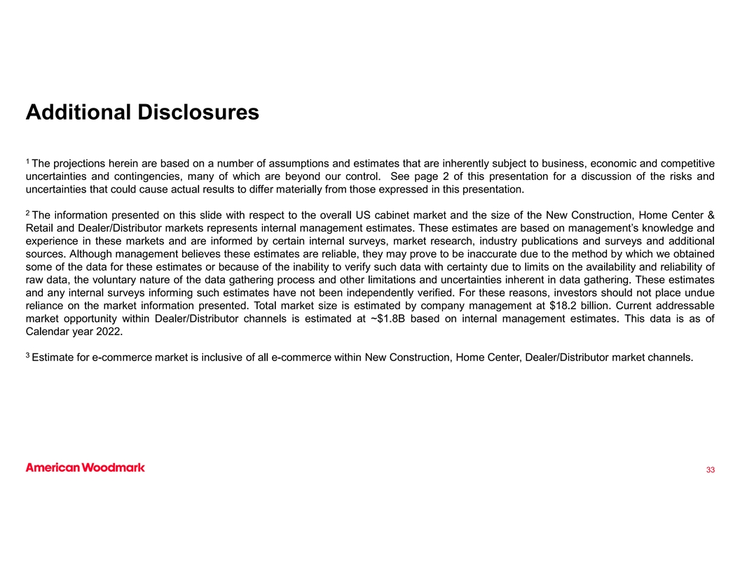 Additional Disclosures 1 The projections herein are based on a number of assumptions and estimates that are inherently subject to business, economic and competitive uncertainties and contingencies, many of which are beyond our control. See page 2 of this presentation for a discussion of the risks and uncertainties that could cause actual results to differ materially from those expressed in this presentation. 2 The information presented on this slide with respect to the overall US cabinet market and the size of the New Construction, Home Center & Retail and Dealer/Distributor markets represents internal management estimates. These estimates are based on management’s knowledge and experience in these markets and are informed by certain internal surveys, market research, industry publications and surveys and additional sources. Although management believes these estimates are reliable, they may prove to be inaccurate due to the method by which we obtained some of the data for these estimates or because of the inability to verify such data with certainty due to limits on the availability and reliability of raw data, the voluntary nature of the data gathering process and other limitations and uncertainties inherent in data gathering. These estimates and any internal surveys informing such estimates have not been independently verified. For these reasons, investors should not place undue reliance on the market information presented. Total market size is estimated by company management at $18.2 billion. Current addressable market opportunity within Dealer/Distributor channels is estimated at ~$1.8B based on internal management estimates. This data is as of Calendar year 2022. 3 Estimate for e-commerce market is inclusive of all e-commerce within New Construction, Home Center, Dealer/Distributor market channels. 33